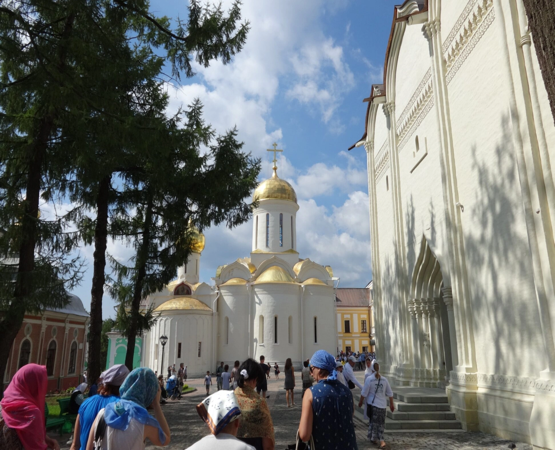 Справа от Троицкого собора видно другое монастырское строение, что позволяет оценить архитектурный ансамбль лавры в его единстве. Территория вокруг собора благоустроена, видны хвойные и лиственные деревья, создающие живописное обрамление для святыни. На переднем плане фотографии можно наблюдать паломников и туристов, следующих по территории монастыря, что свидетельствует о непрекращающемся потоке верующих к этой великой святыне.