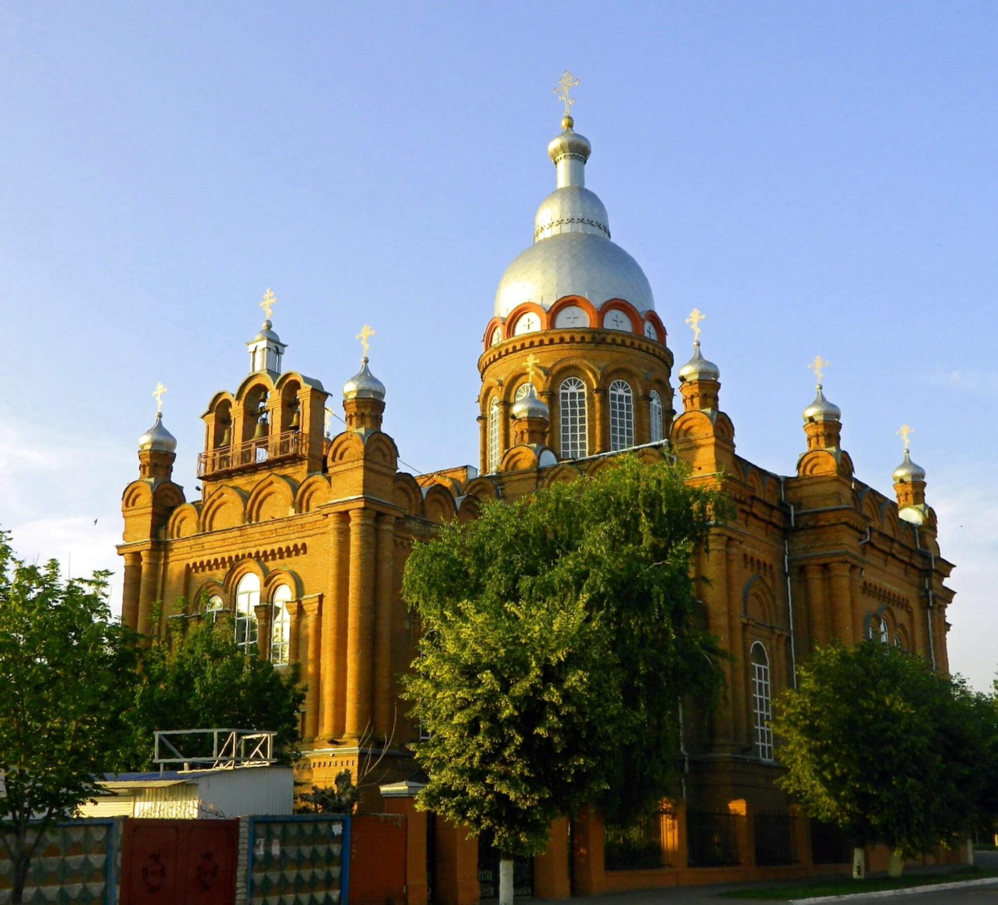 На представленной фотографии запечатлён Свято-Троицкий собор, расположенный в историческом центре города Обояни Курской области. Этот монументальный православный храм, возведённый во второй половине XIX столетия, является выдающимся памятником церковной архитектуры и духовным центром всего региона.