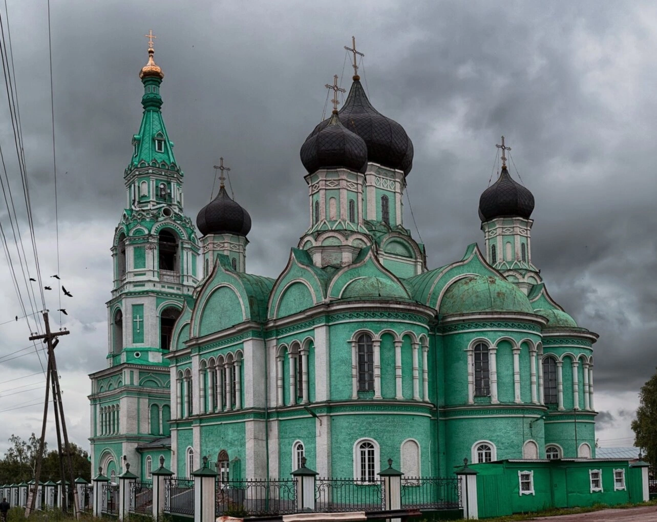 Особого внимания заслуживает композиционное решение собора: мощный четверик увенчан пятью главами, символизирующими Христа и четырех евангелистов. Черные купола с золотыми звездами contrastно выделяются на фоне небесной лазури, а золотой шпиль колокольни, достигающий значительной высоты, служит вертикальной доминантой всего архитектурного ансамбля.