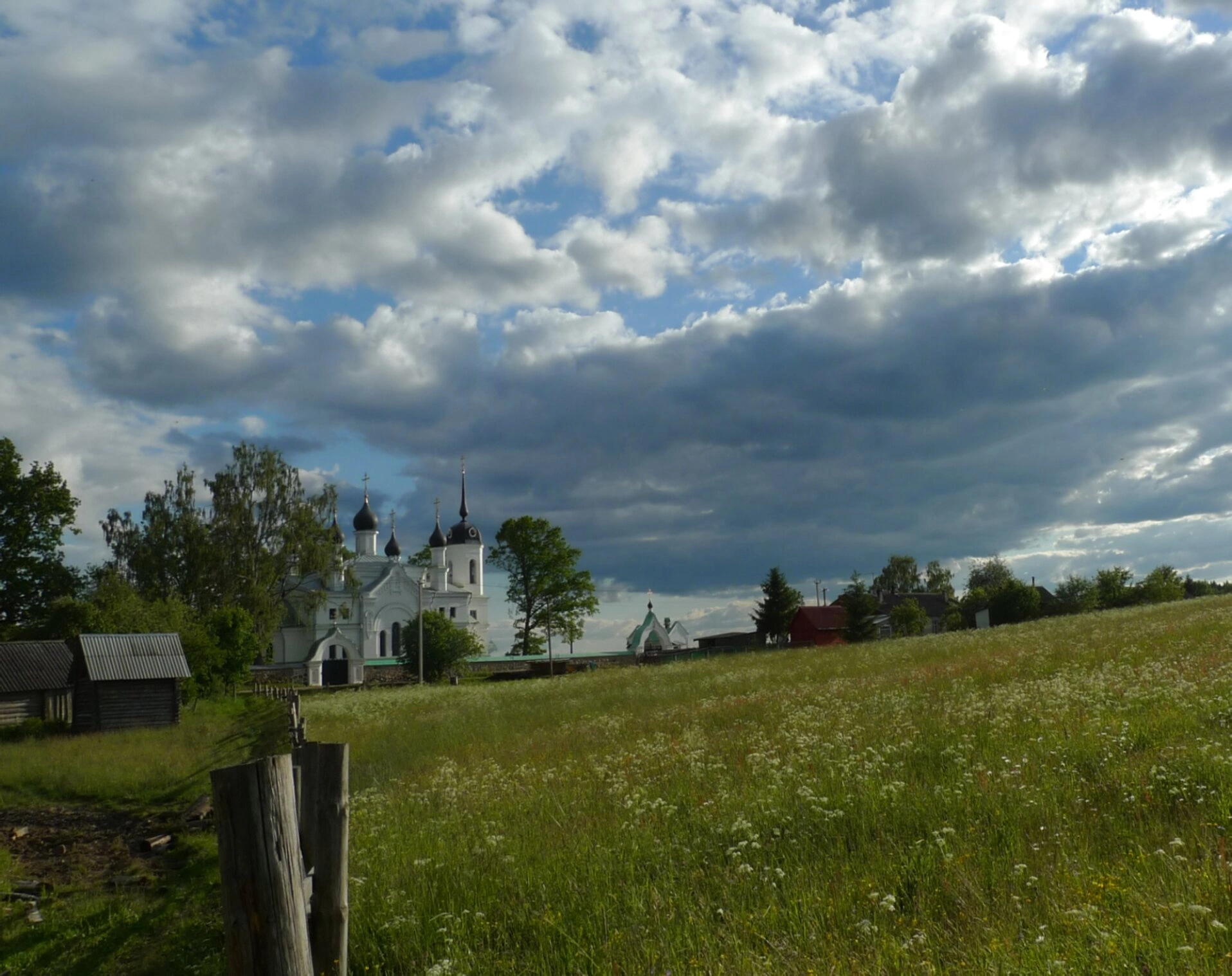 На фотографии запечатлён Свято-Троицкий Творожковский женский монастырь, расположенный в Струго-Красненском районе Псковской области. Святая обитель, утопающая в зелени полевых трав и цветов, предстаёт в ореоле тишины и благодати, являя собой образец уединённой монашеской жизни в гармонии с русской природой.