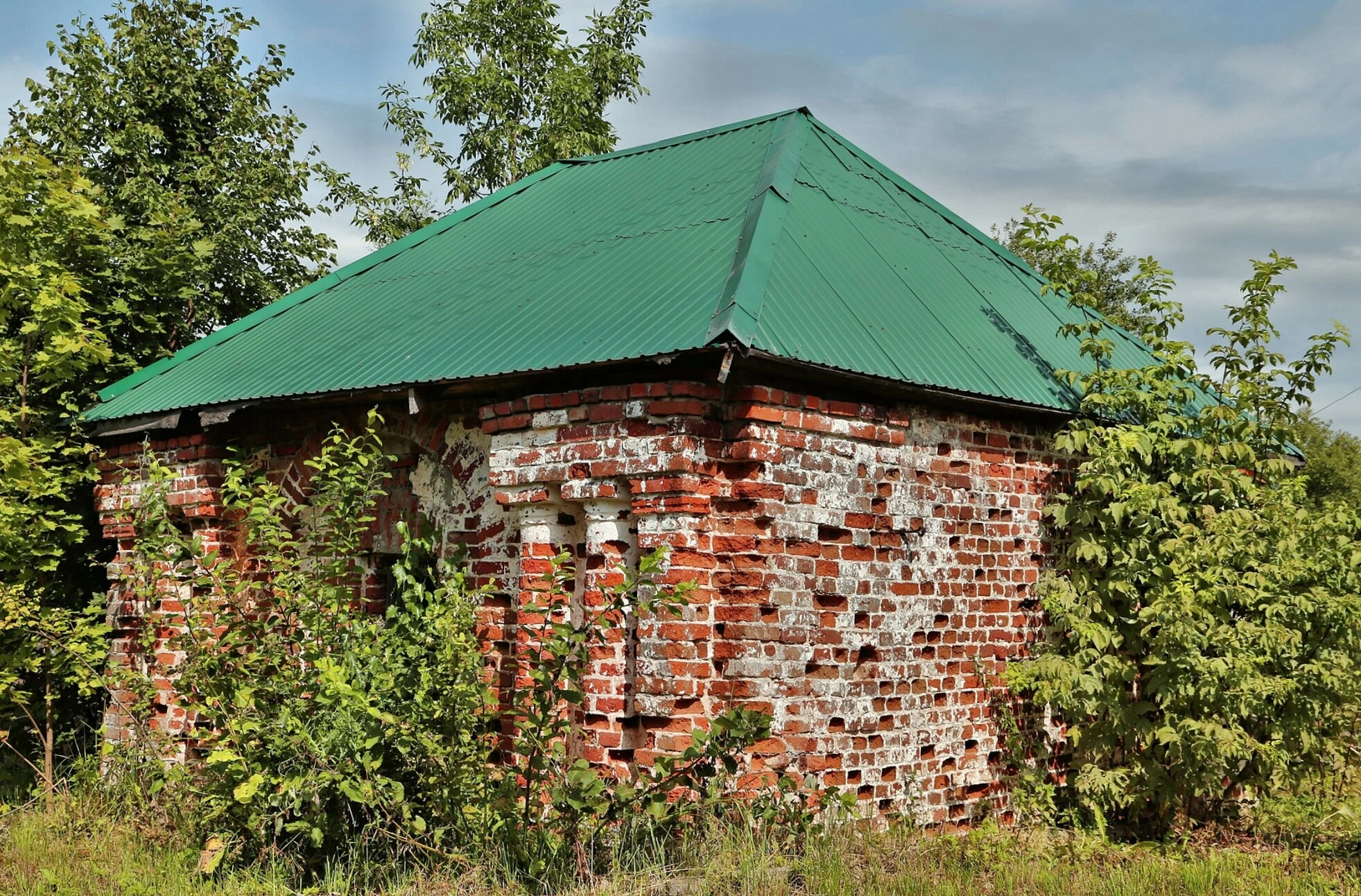 На фотографии запечатлена угловая башня каменной ограды, принадлежавшей храму великомученицы Параскевы Пятницы в селе Морозово Тейковского района Владимирской области. Сооружение представляет собой кирпичную постройку второй половины XIX века, выполненную в традициях позднего классицизма с элементами православной храмовой архитектуры. Башня имеет квадратное сечение и завершается шатровой крышей, покрытой листовым железом зелёного цвета, что характерно для многих церковных построек данного периода.