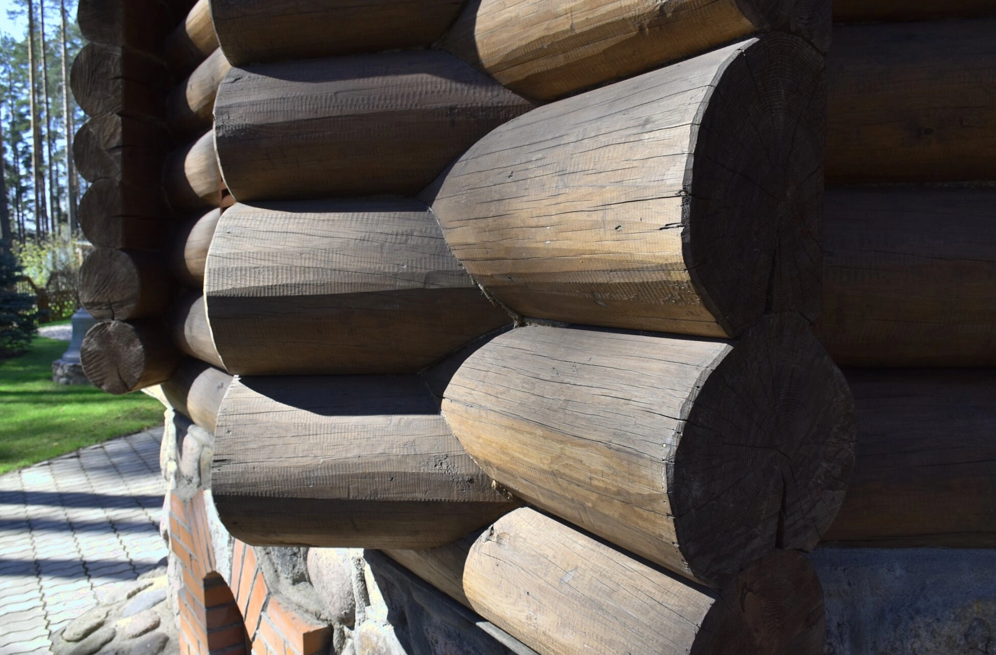 Поверхность брёвен носит следы естественного бытования: видны мелкие трещины-усушки, которые являются неотъемлемой частью жизни древесины и придают постройке особую душевность и подлинность. Снимок сделан в солнечный день, когда свет подчёркивает текстуру дерева и отбрасывает глубокие тени, выявляя всю пластику сооружения. На заднем плане угадывается ухоженная территория храма с зелёной травой и мощёными дорожками, что создаёт ощущение благоустроенности и молитвенного покоя.