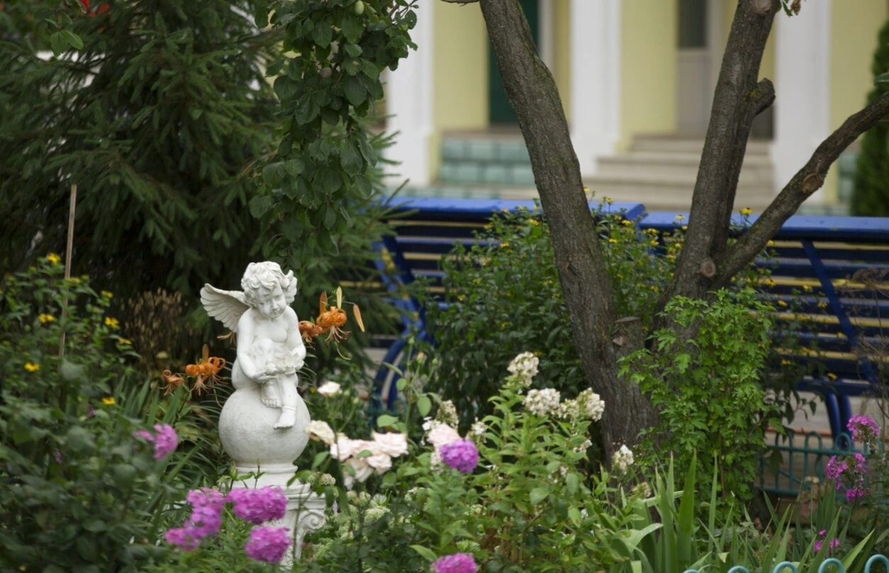 На фотографии запечатлён фрагмент благоустроенной территории, принадлежащей Свято-Троицкому храму города Батайска. На переднем плане, в окружении пышной растительности, расположена изящная белокаменная скульптура ангела, восседающего на сферическом постаменте. Этот образ символизирует небесное заступничество и придает уголку сада особую духовную атмосферу.