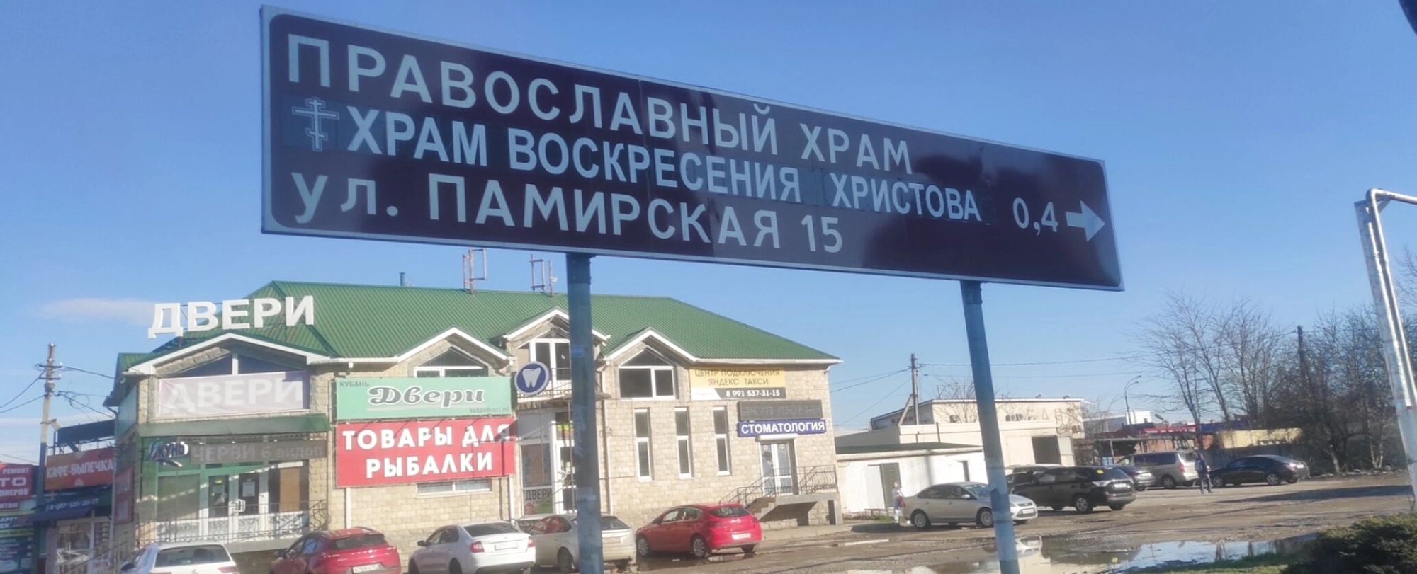 На фотографии запечатлён дорожный указатель, направляющий православных верующих и паломников к Храму Воскресения Христова, расположенному в городе Краснодаре по адресу: улица Памирская, дом 15. Чёткая надпись «ПРАВОСЛАВНЫЙ ХРАМ» и наименование святыни служат ориентиром для всех, кто ищет путь к дому Божиему. Указатель сообщает, что до храма остаётся всего 0,4 километра, что символизирует близость спасения и утешения для человеческой души.