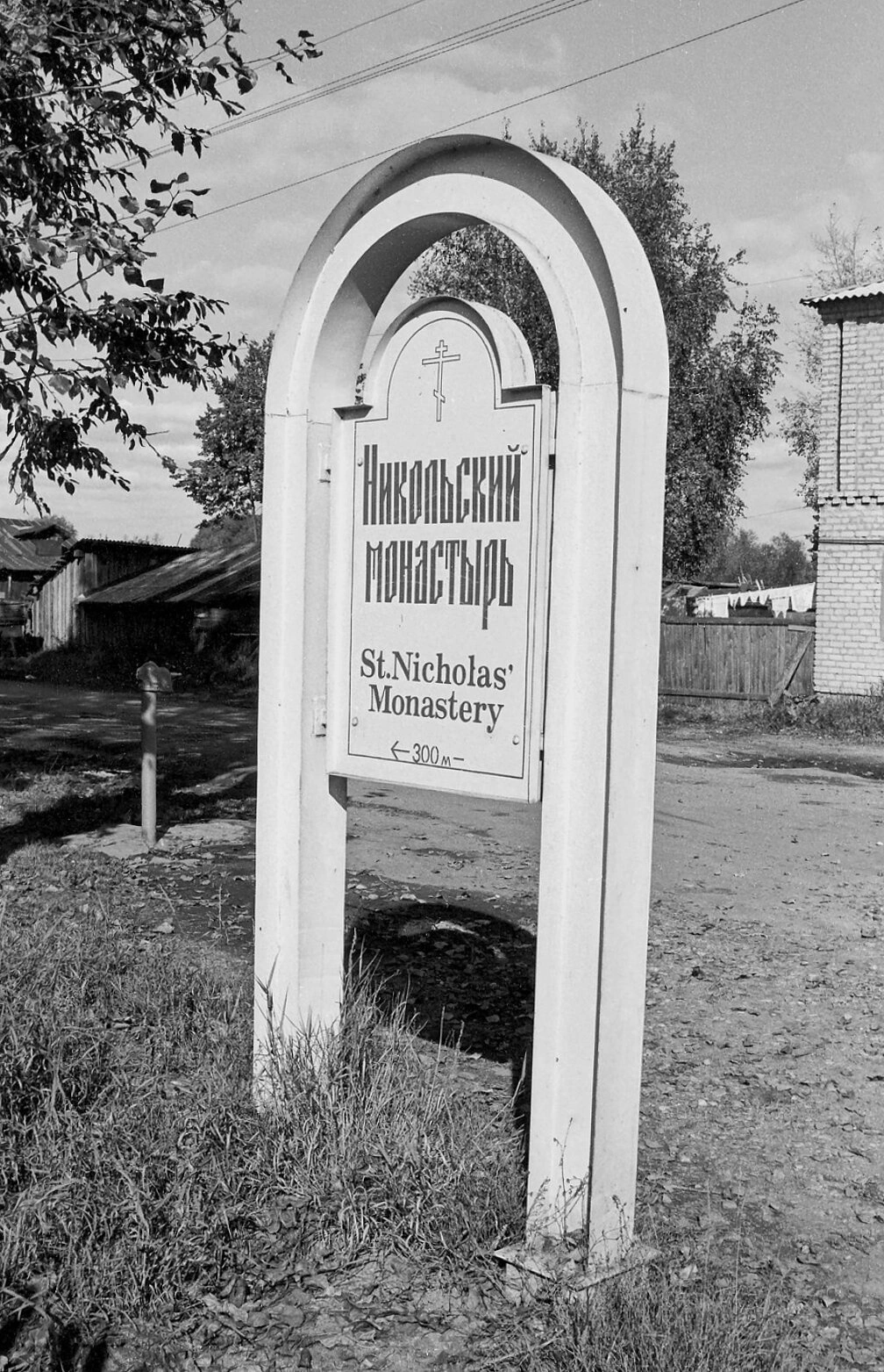 Указатель четко сообщает наименование обители — «Никольский монастырь», а стрелка, направленная влево, указывает верное направление движения к святыне. Под стрелкой обозначено расстояние до монастырских врат — 300 метров, что позволяет путнику сориентироваться в приблизительном времени пути.