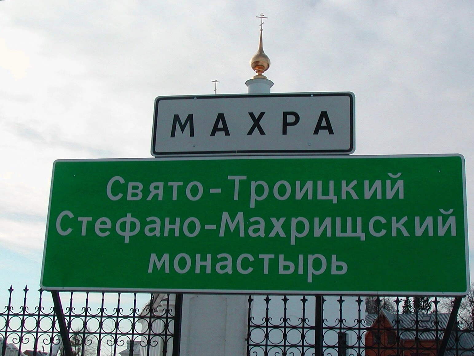 На фотографии запечатлен дорожный указатель, направляющий паломников и богомольцев к одной из древних святынь Владимирской земли – Свято-Троицкому Стефано-Махрищскому ставропигиальному монастырю. Зеленый щит указателя с крупной белой надписью «Свято-Троицкий Стефано-Махрищский монастырь» и дополнительная белая табличка с черной надписью «МАХРА» не оставляют сомнений в предназначении пути.