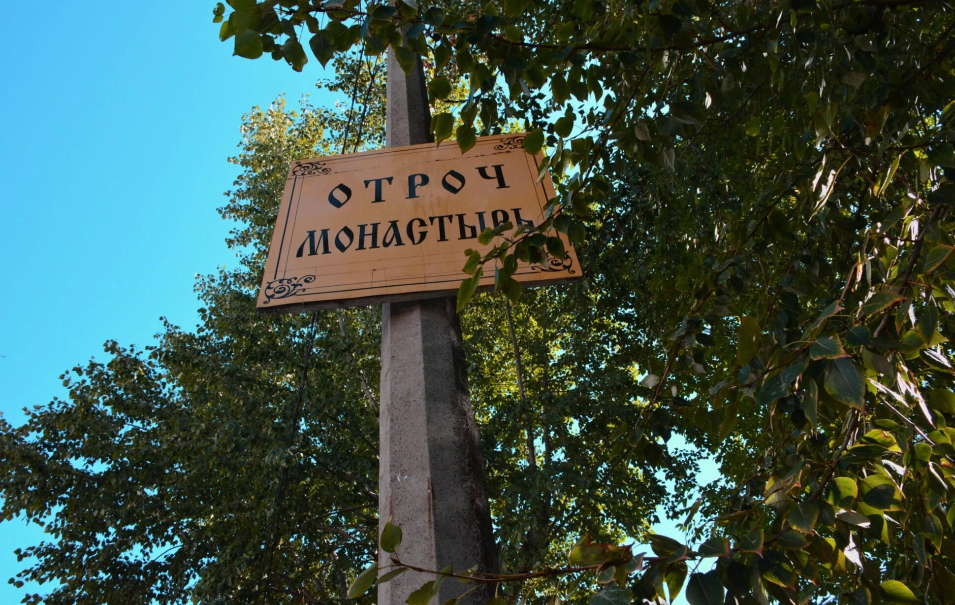 На представленной фотографии запечатлен дорожный указатель с четкой надписью «ОТРОЧ МОНАСТЫРЬ», направляющий паломников и верующих к одной из древнейших тверских святынь. Знак установлен на прочном столбе, окруженный свежей зеленью деревьев, под чистым голубым небосводом, что создает особое настроение духовного предвкушения.