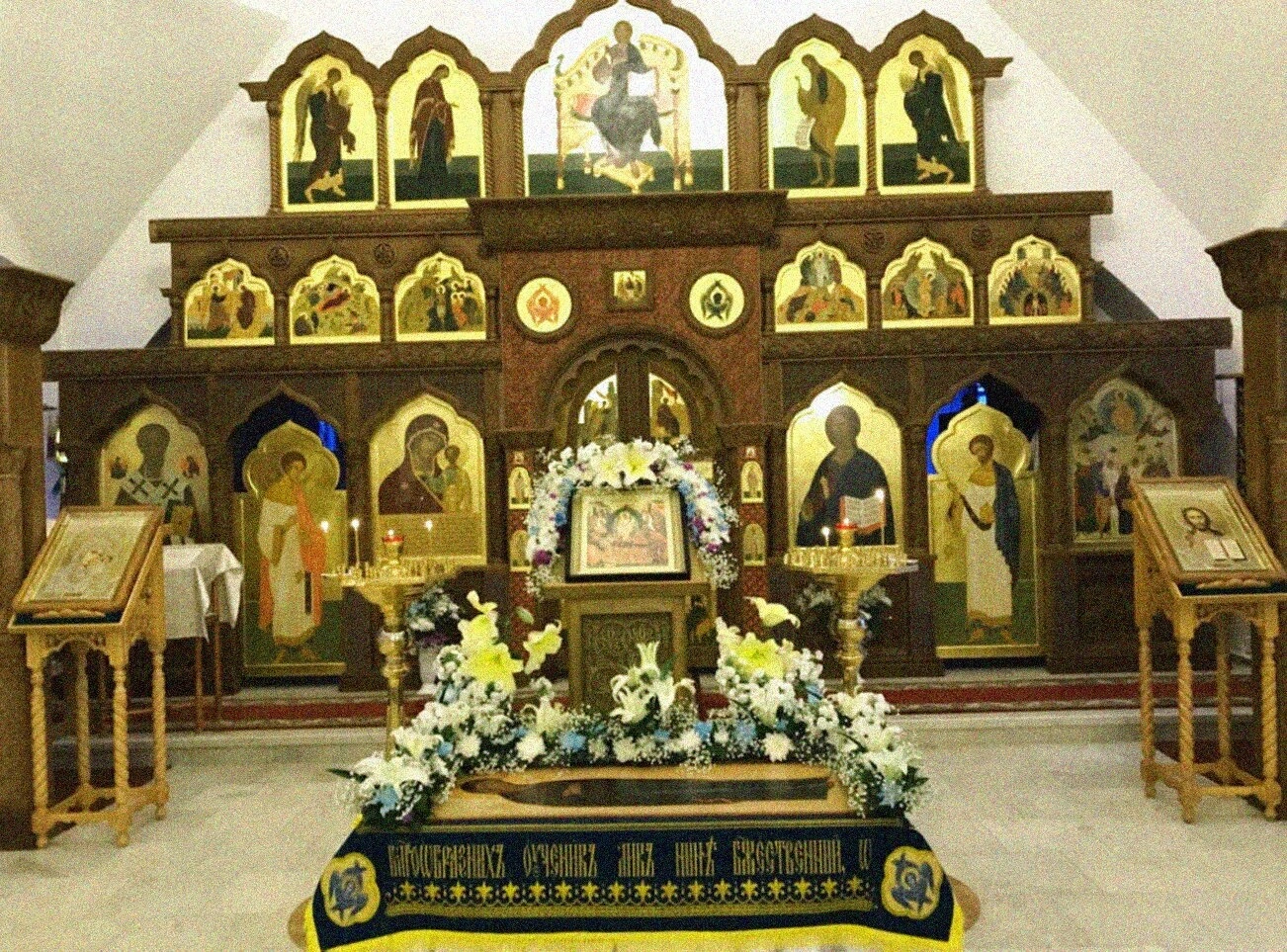 Убранство храма, включающее резные детали, богатые оклады икон и церковную утварь, отражает глубокую духовную традицию и заботу прихожан о своём духовном доме. Данное изображение передаёт не только архитектурные особенности храма, но и запечатлевает момент церковного таинства и молитвенной памяти, являясь ярким свидетельством живой веры и православной культуры.