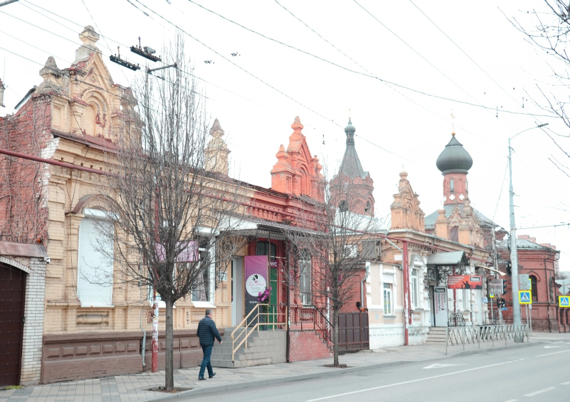 Примечателен зимний характер пейзажа: деревья без листвы и одинокий прохожий, идущий по тротуару, создают ощущение тишины и светлой грусти, что свойственно для холодного времени года. Фотография передаёт неповторимый облик Краснодара, где гармонично переплетаются история, светская жизнь и глубокая православная вера.