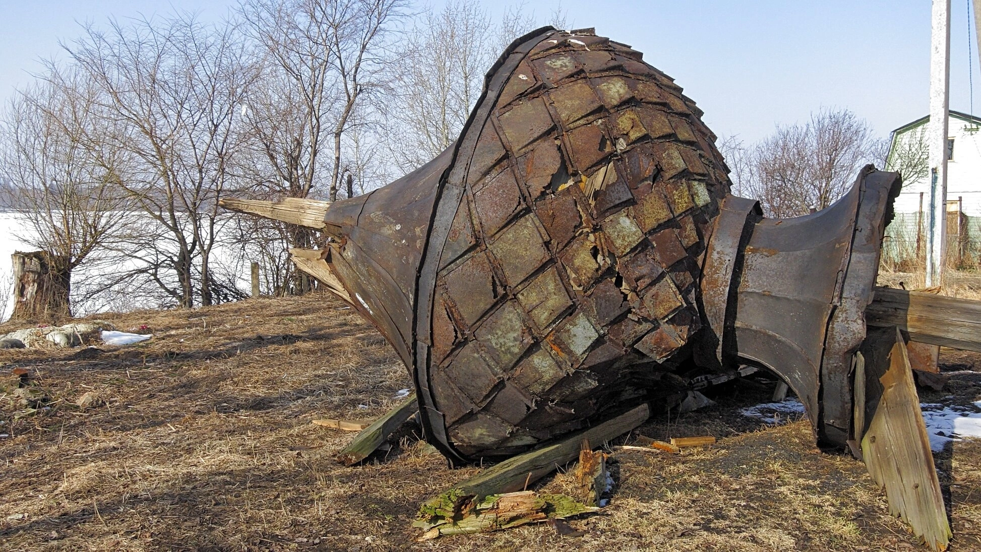 На представленной фотографии запечатлён трагический момент в истории православной святыни — упавший купол церкви Смоленской иконы Божией Матери, расположенной в селе Устье Ярославской области. Монументальный металлический купол, некогда венчавший храмовый комплекс, ныне покоится на земле, являя собой скорбное зрелище разрушения и забвения.