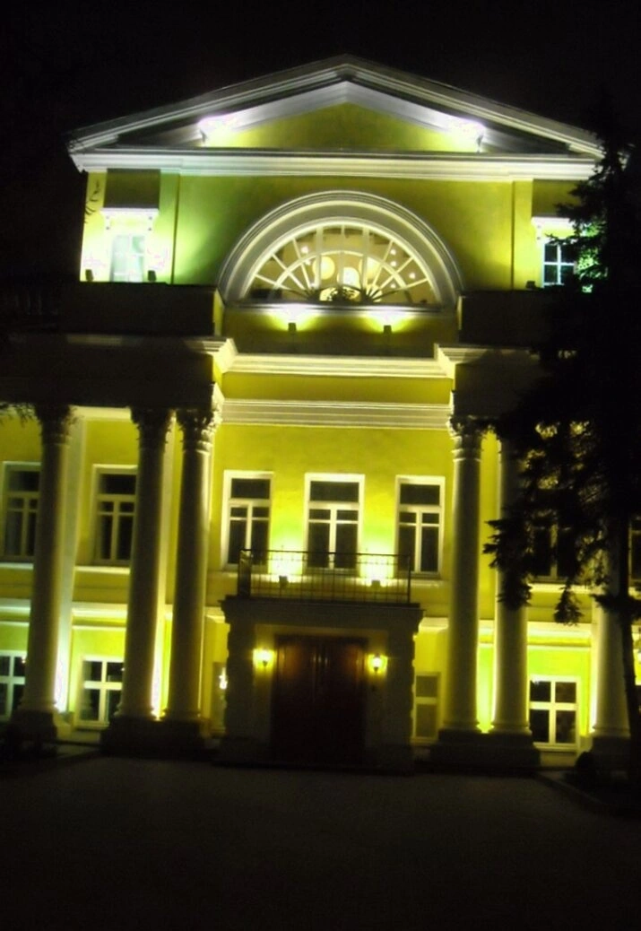 Особого внимания заслуживает искусная ночная подсветка, которая мастерски выделяет архитектурные детали: колонны освещены как снизу, так и сверху, что подчёркивает их тектоническую выразительность. В центре композиции второго этажа расположено большое полукруглое окно с декоративной кованой решёткой, добавляющее зданию особый шарм и изысканность.