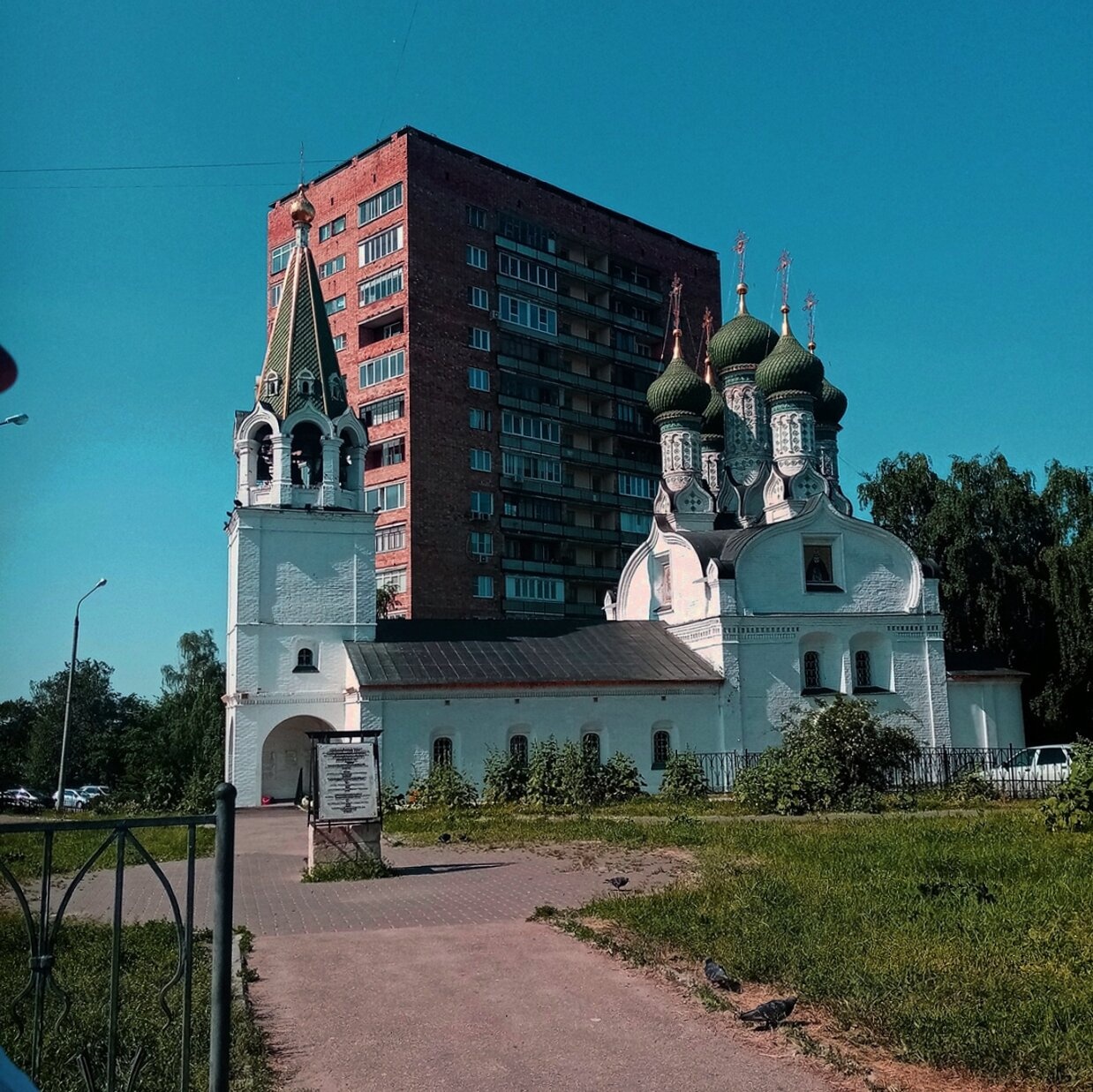 На переднем плане фотографии видна грунтовая дорожка, ведущая к святому месту, и ухоженный газон, где нашли пристанище голуби, символизирующие мир и божественное присутствие. Исторический храм, несмотря на окружающую современную городскую застройку, сохраняет свою благодатную силу и духовное величие. Многоэтажное кирпичное здание на заднем плане лишь подчёркивает уникальность и древность святого места.