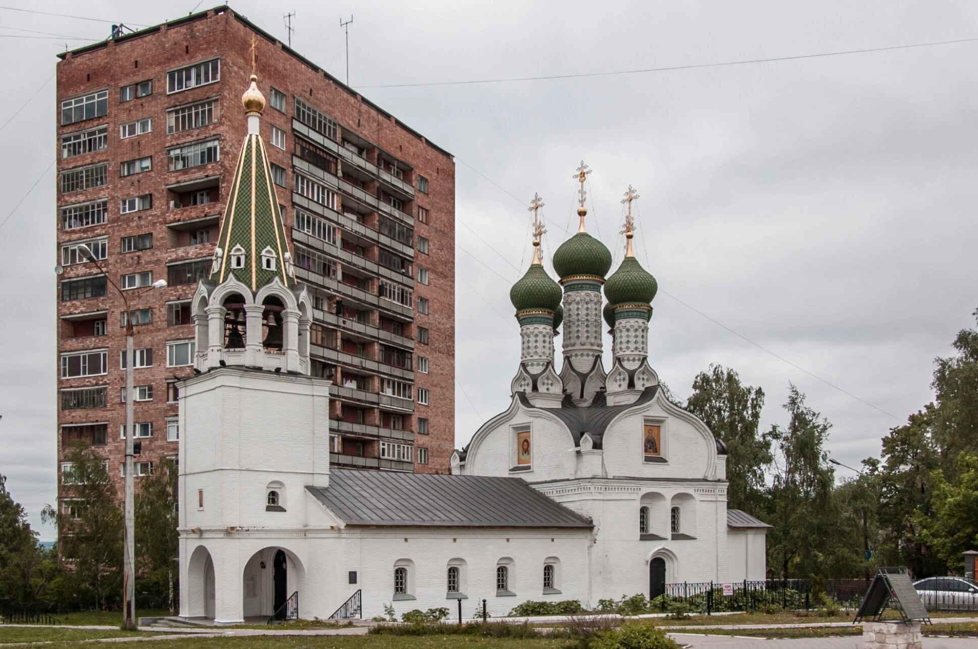 На снимке также видно, что исторический храм гармонично, хотя и несколько тесно, соседствует с современной городской застройкой, в данном случае — с высоким жилым зданием из красного киртерича. Это соседство старого и нового подчёркивает непрерывность духовной жизни города, которая сохраняется сквозь века. Окружающий пейзаж с зеленью деревьев и элементами городской инфраструктуры создаёт ощущение органичного вписывания святыни в повседневную жизнь православных нижегородцев. Пасмурное небо с рассеянным светом придаёт фотографии особую, сдержанную и лирическую атмосферу, выделяя благородную белизну стен древнего храма.