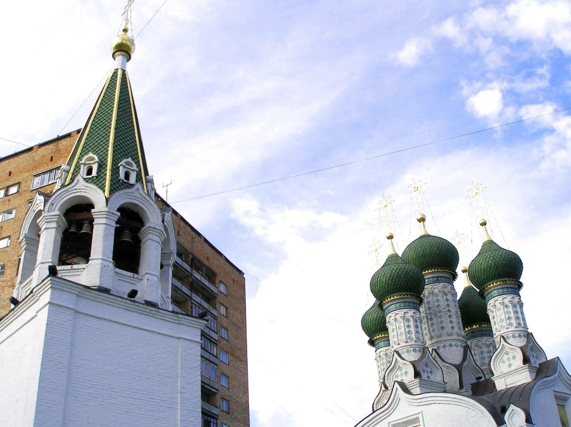 Белоснежные стены церкви, сложенные из камня, контрастируют с насыщенной зеленью кровли глав и ярусами зелёных крыш, украшенных изящными кокошниками. Рядом с храмом высится стройная шатровая колокольня, являющаяся неотъемлемой частью архитектурного ансамбля. Поблизости видно многоэтажное кирпичное здание, однако оно нисколько не умаляет святости и красоты этого намоленного места.