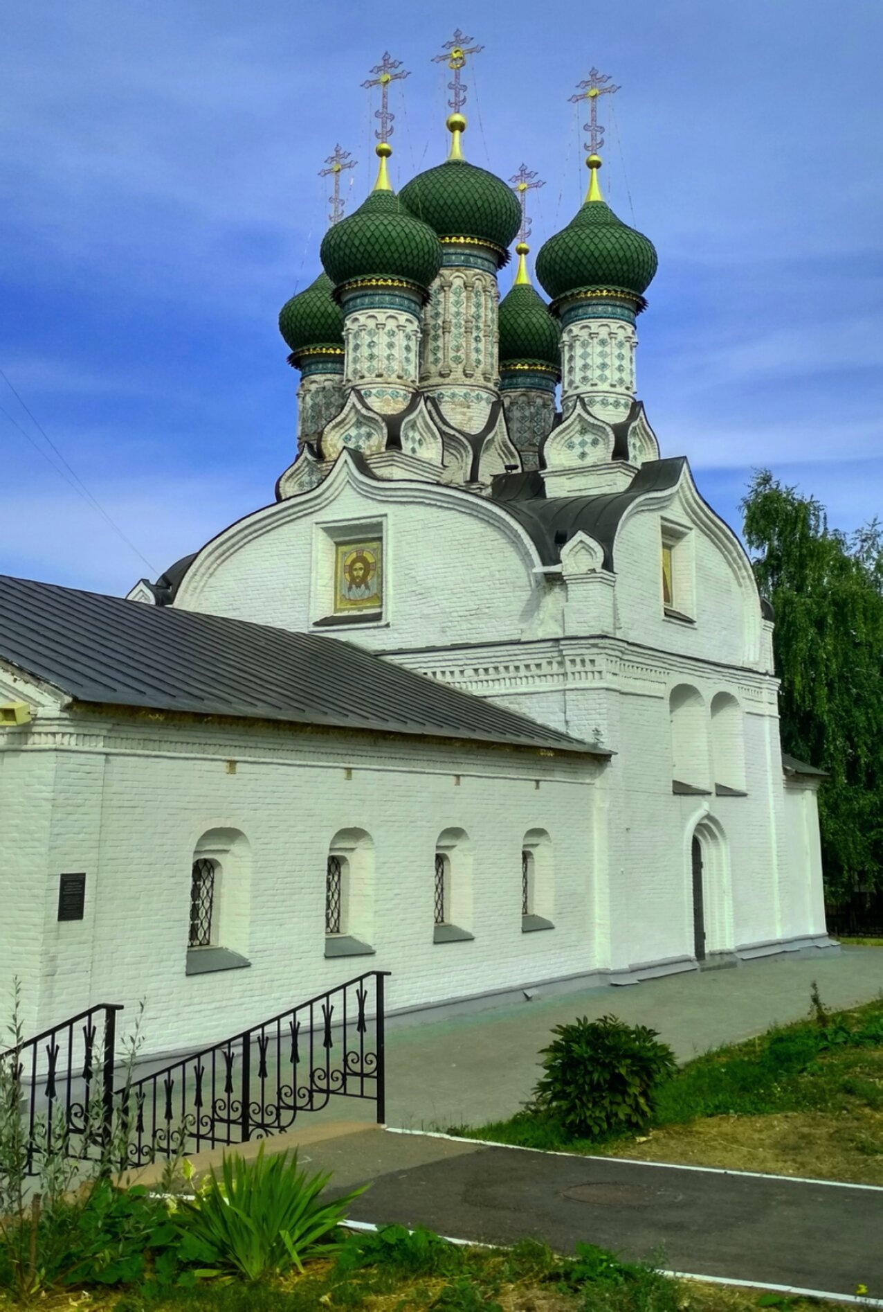 На переднем плане фотографии можно видеть закреплённую на фасаде храмовую икону, перед которой верующие возносят свои молитвы. Территория вокруг церкви благоустроена: каменная дорожка ведёт к входу, а чугунные перила лестницы свидетельствуют о заботливом отношении к этой святыне. Зелёные насаждения, среди которых угадывается юкка, дополняют картину уюта и благолепия этого святого места.