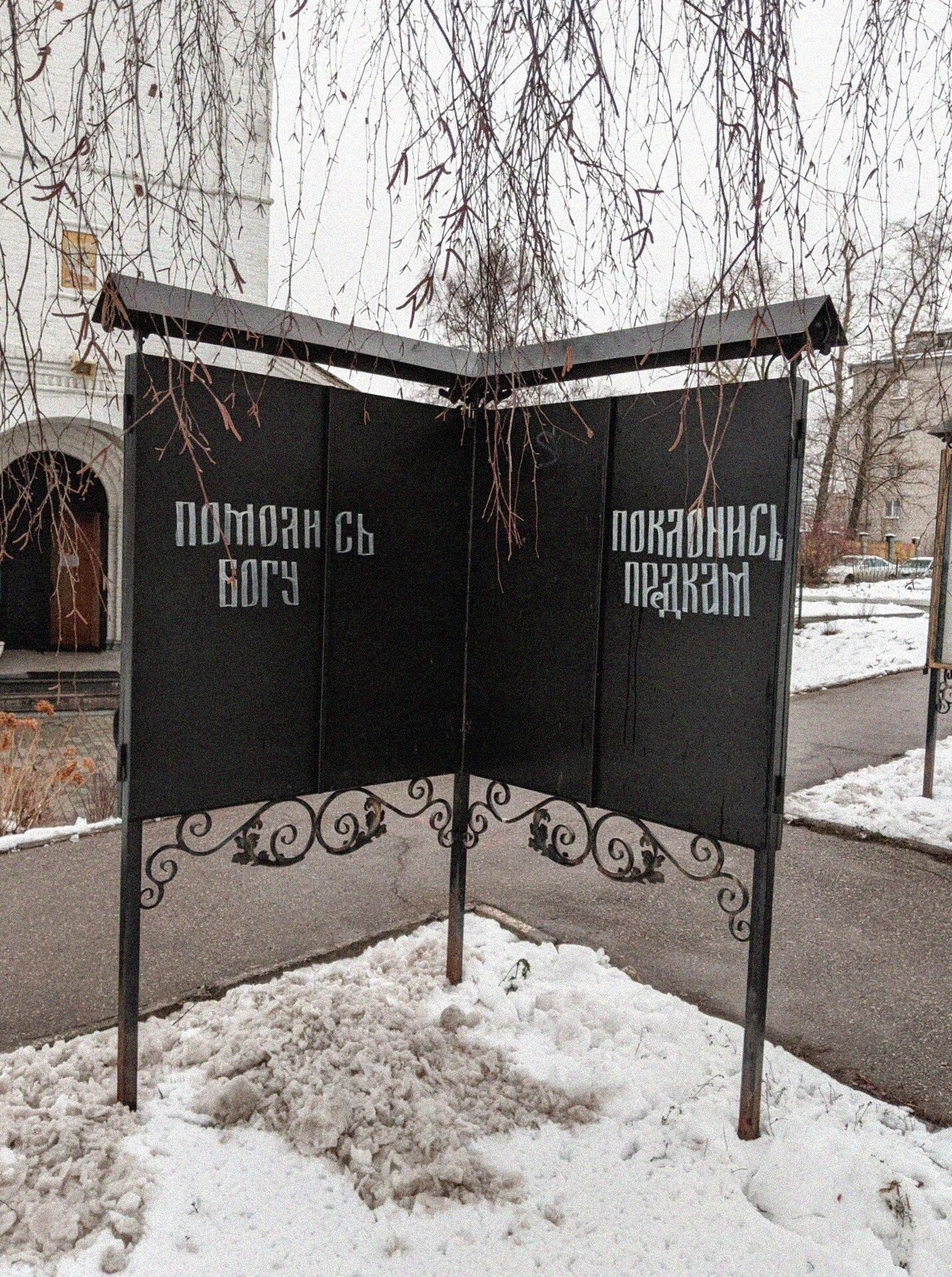Информационный стенд, расположенный на первом плане, содержит сведения на русском языке, предназначенные для паломников и туристов, желающих узнать больше об истории святого места. Подобные указатели служат духовным ориентиром, помогая верным найти дорогу к храму даже в самое суровое время года. Зимний пейзаж придаёт всей композиции особую тишину и благоговейную торжественность, напоминая о вечных ценностях и непреходящей красоте православной веры.
