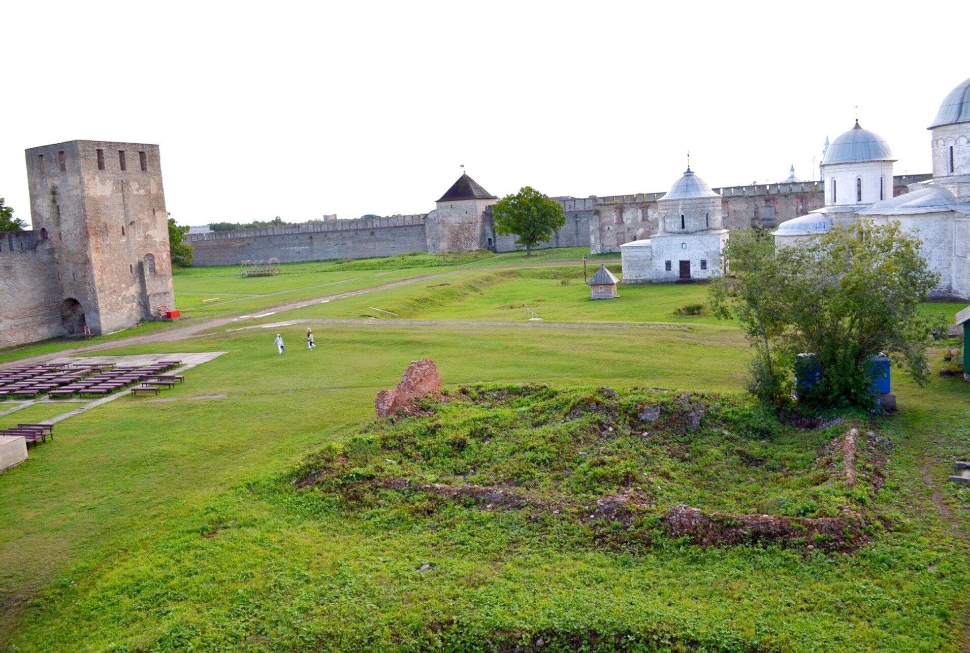 Передний план фотографии занимает ухоженная территория с зелёным газоном, где сохранились фрагменты старинной каменной кладки, напоминающие о богатой истории этого места. Присутствующие на снимке деревянные скамейки создают атмосферу умиротворённости и располагают к благоговейному созерцанию святынь. Несколько человек, прогуливающихся по территории, помогают оценить масштаб архитектурного комплекса.