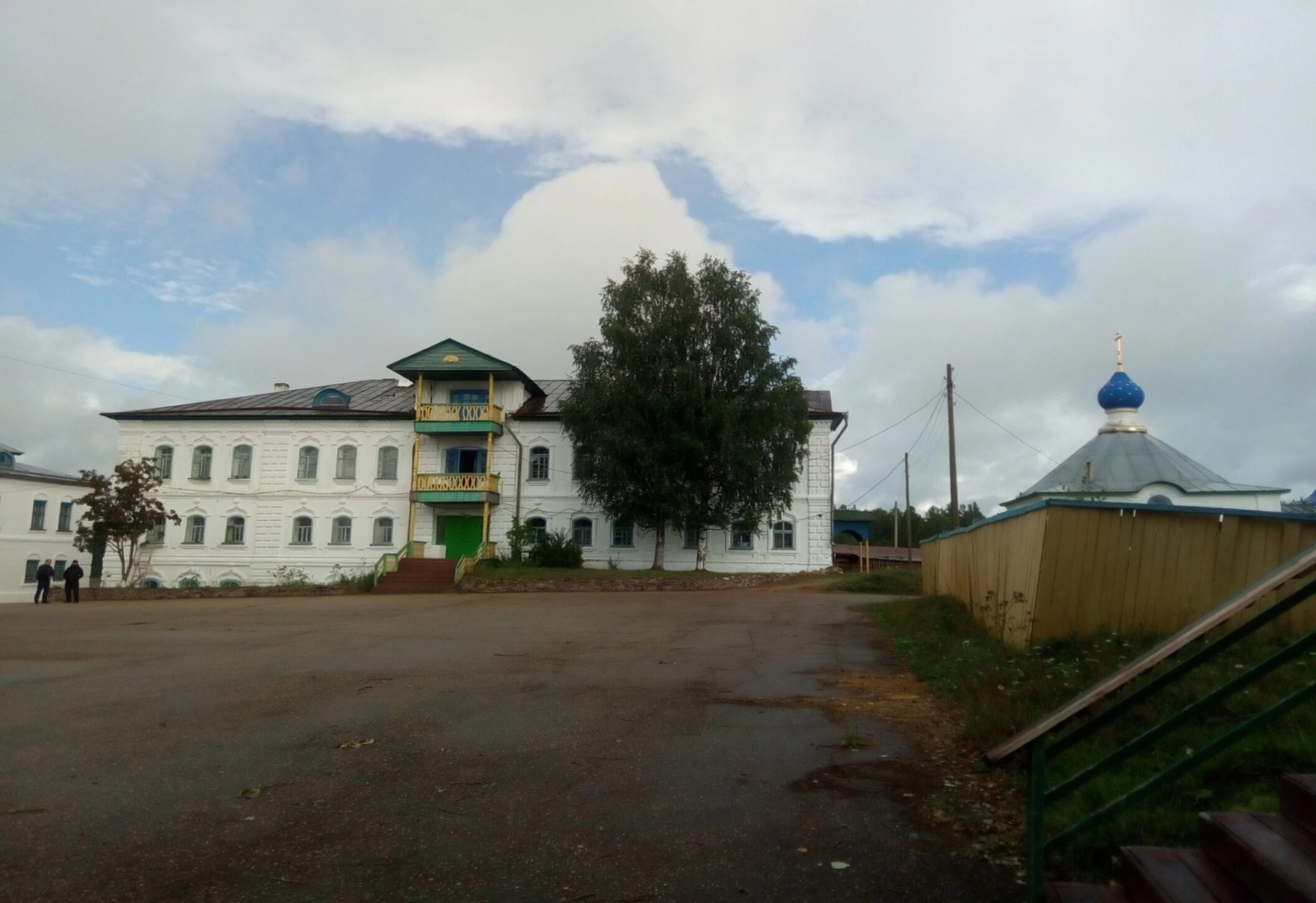 На переднем плане изображена монастырская площадь с грунтовым покрытием, в центре которой возвышается высокое дерево с пышной кроной, символизирующее духовное возрождение и жизненную силу этой святой земли. Слева расположено двухэтажное белое здание с зеленой кровлей и резным балконом, характерное для севернорусского монастырского зодчества.