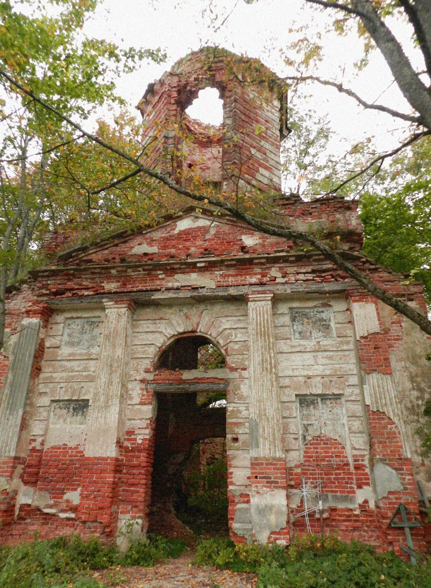 Прихрамовая территория поросла травой и молодыми деревьями, которые, обступив здание, подчеркивают его заброшенное состояние. У основания стен виднеются опавшие листья и природный мусор, свидетельствующие о длительном отсутствии реставрационных работ и должного ухода.