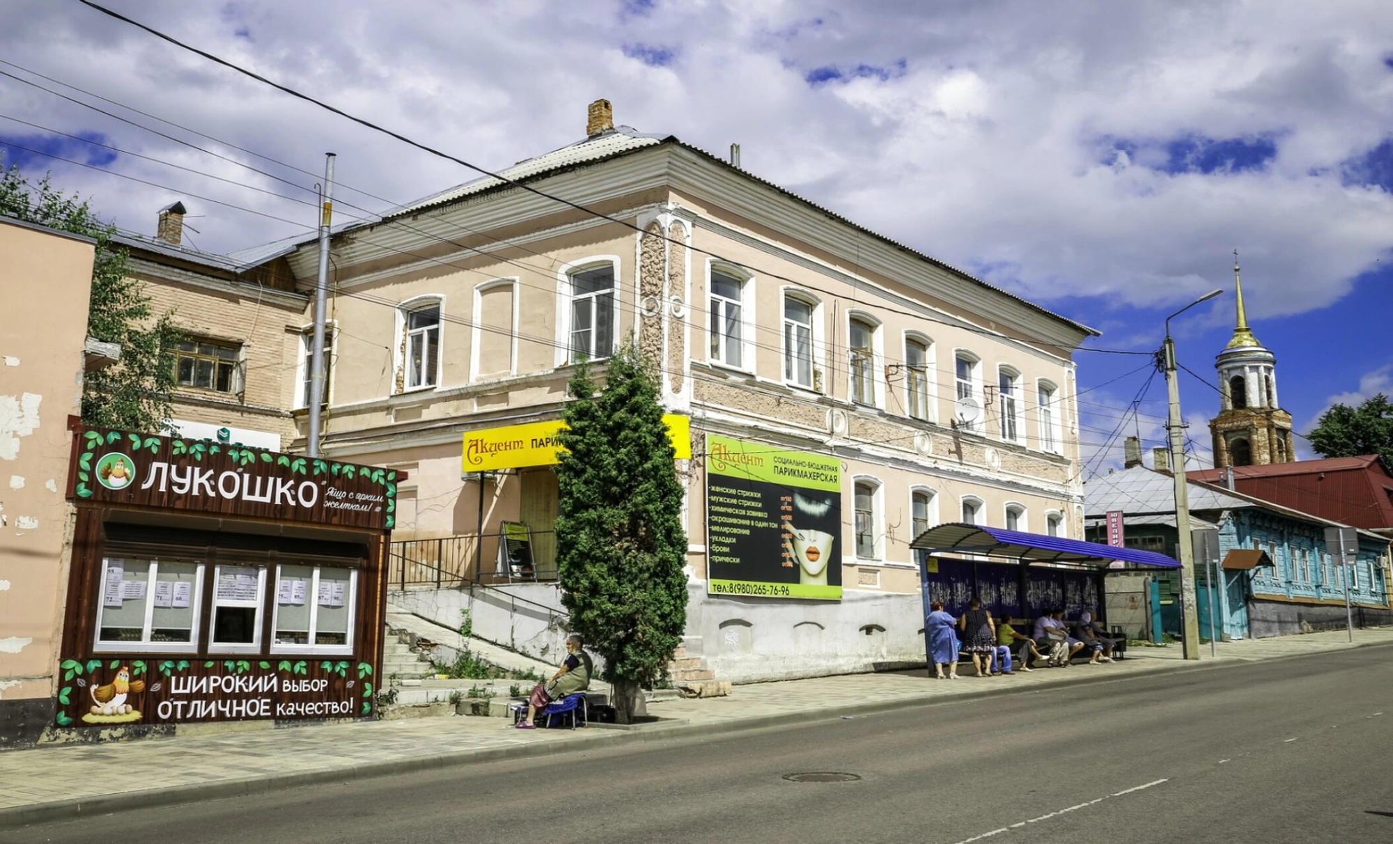 Передний план композиции занимает двухэтажное здание пастельно-розового цвета с изящной лепниной и белыми оконными обрамлениями. На первом этаже здания располагается магазин «ЛУКОШКО» с благообразной вывеской. Рядом с ним находится автобусная остановка с синим навесом, под сенью которой ожидают транспорт несколько человек.