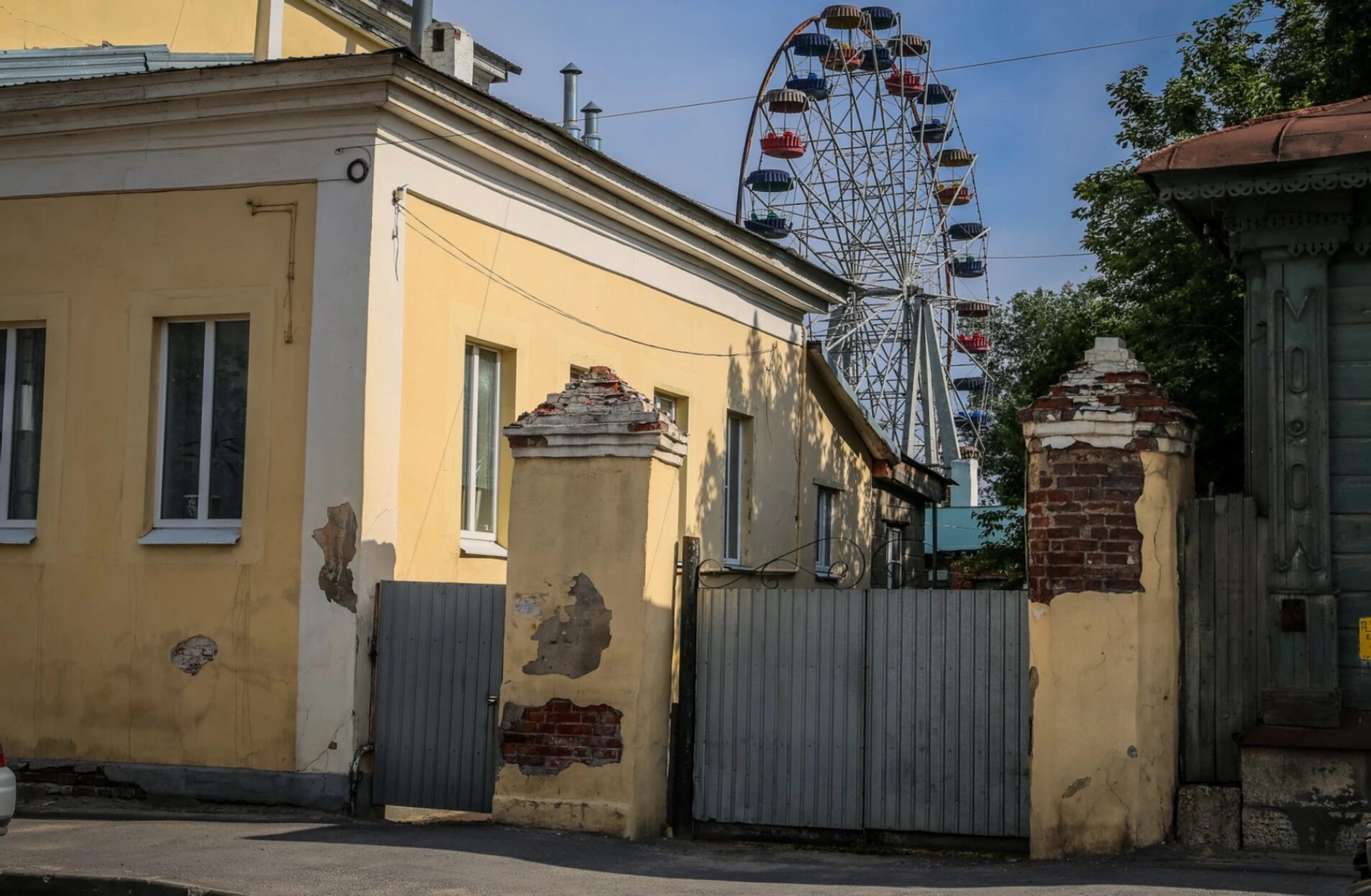 На представленной фотографии запечатлён уникальный вид на Успенскую церковь в историческом городе Ельце. На переднем плане изображён фрагмент жёлтого здания с белыми оконными проёмами, а также старинные ворота с кирпичными столбами, демонстрирующие характерную для елецкой архитектуры кладку. За первыми воротами просматриваются дополнительные серые ворота, создающие глубину пространственной композиции.