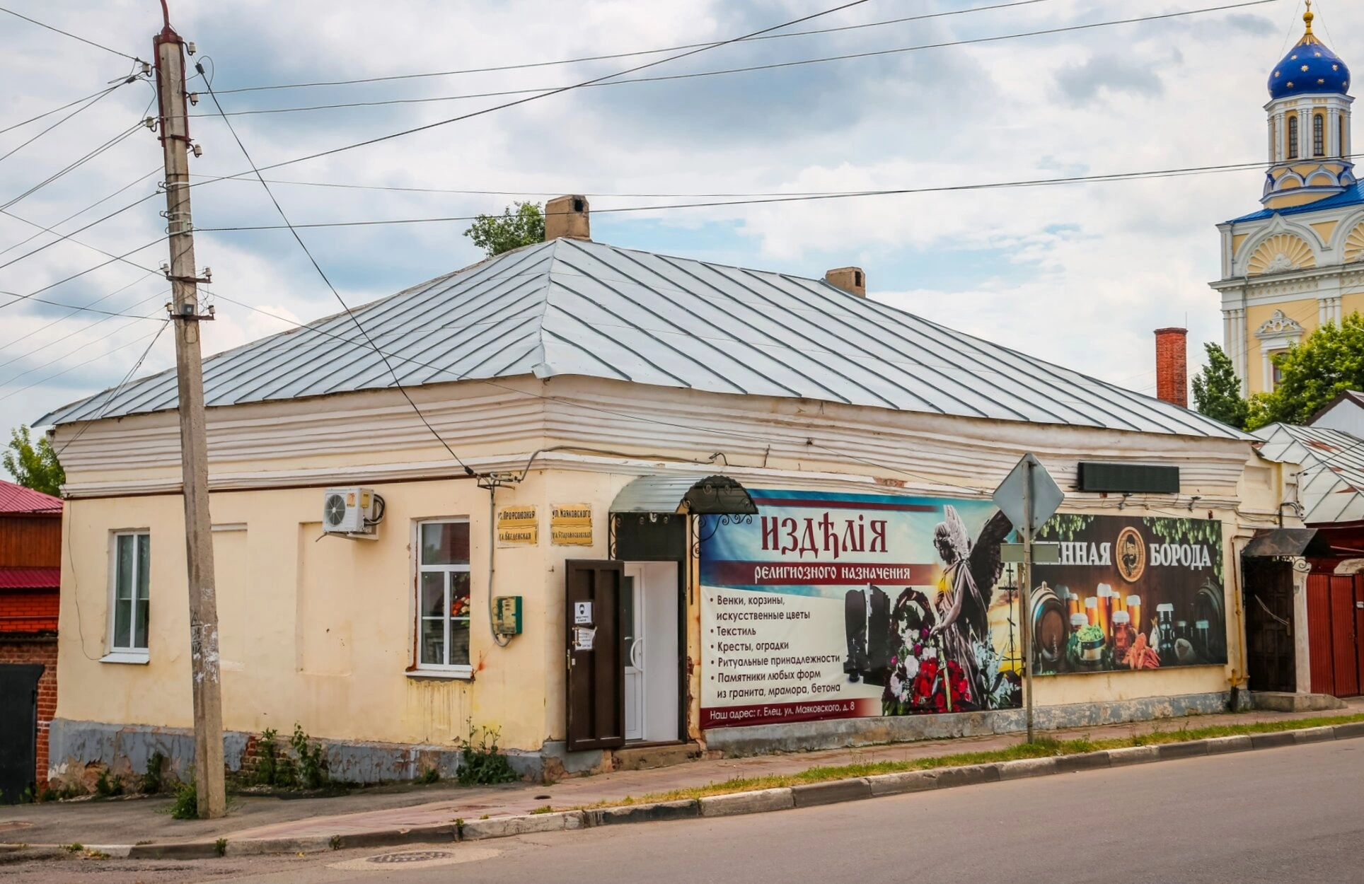 На представленной фотографии запечатлён архитектурный ансамбль улицы Маяковского в историческом городе Ельце Липецкой области. На переднем плане изображено одноэтажное здание дореволюционной постройки, в котором размещаются магазин ритуальных принадлежностей и парикмахерская. Вывески на фасаде сохранили дореформенную орфографию: «ИЗДѢЛІЯ РЕЛИГИОЗНОГО НАЗНАЧЕНІЯ» и «ННАЯ БОРОДА», что свидетельствует о богатой истории здания.