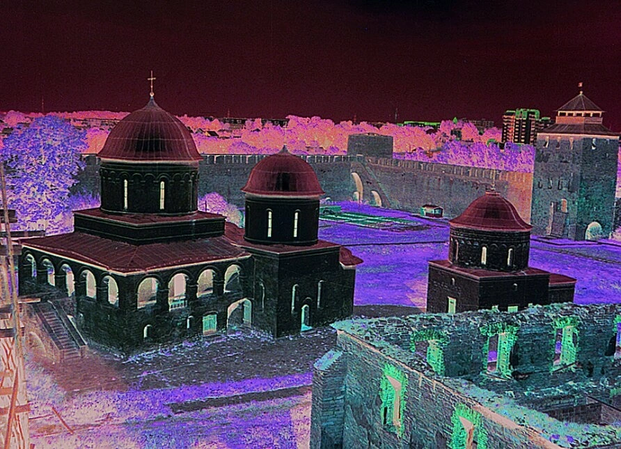 На представленной фотографии запечатлён вид на Свято-Успенский храм, расположенный на территории древней Ивангородской крепости. Этот православный собор, освящённый в честь Успения Пресвятой Богородицы, является одним из старейших храмов Ленинградской земли и духовным центром города Ивангорода.