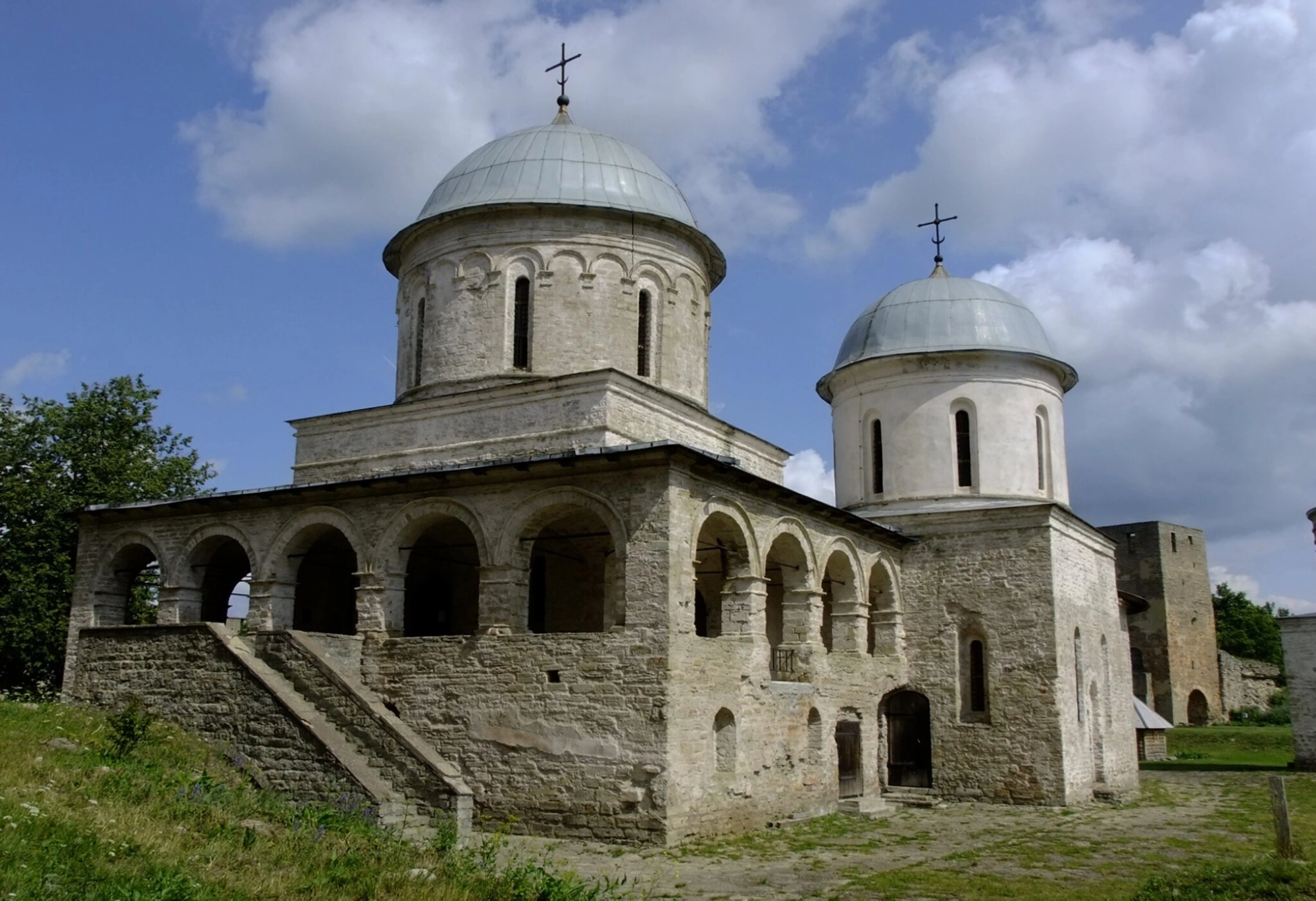 Храмовая постройка, датируемая XVI столетием, представляет собой классический образец псковской архитектурной школы. На снимке чётко просматривается строгий и лаконичный объем собора, увенчанный традиционным шлемовидным куполом, который водружён на массивный световой барабан и увенчан золочёным крестом, сияющим во славу Господа. Фасад здания, выполненный из местного известняка, отличается монументальностью и духовной строгостью.