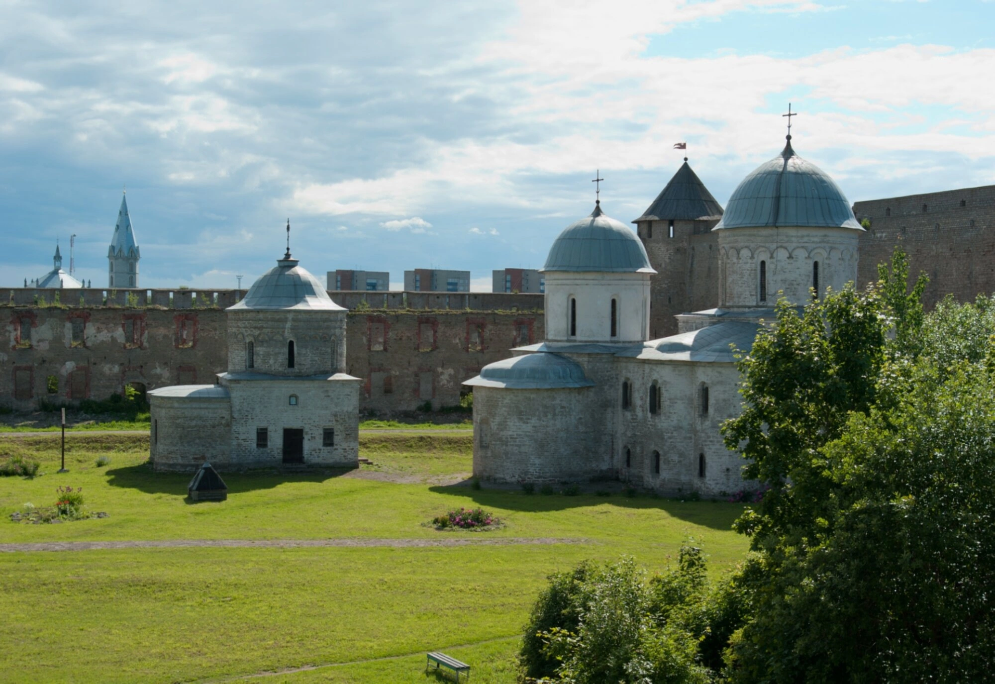 На представленной фотографии запечатлена Успенская церковь, расположенная на территории Ивангородской крепости. Этот православный храм является неотъемлемой частью историко-архитектурного ансамбля крепости, основанной по указу царя Ивана III в 1492 году на правом берегу реки Нарвы.