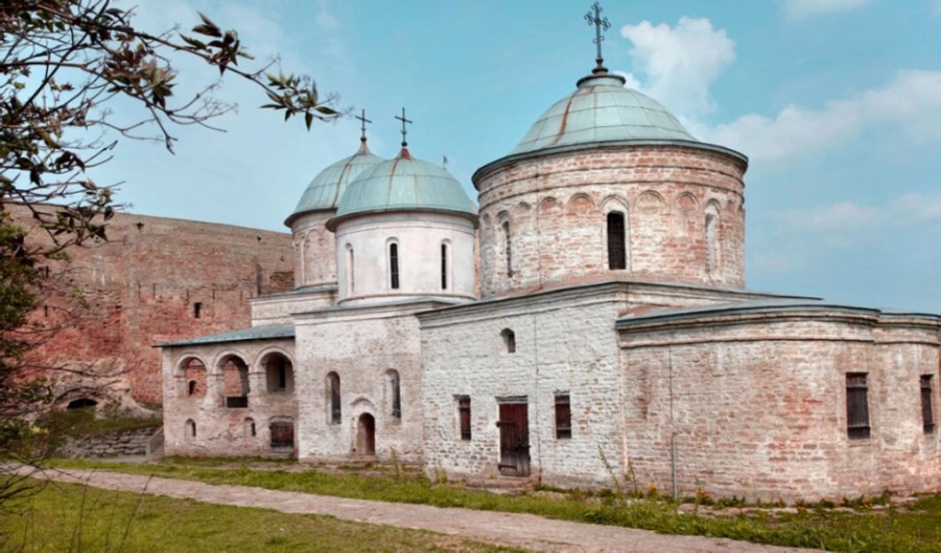 На представленной фотографии запечатлена старинная православная святыня — Успенская церковь, расположенная на территории Ивангородской крепости в Ленинградской области. Храм освящён в честь Успения Пресвятой Богородицы, о чём свидетельствует его официальное название и категория в Wikimedia Commons. Исторически он также был известен как Никольский, по имени одного из своих приделов.