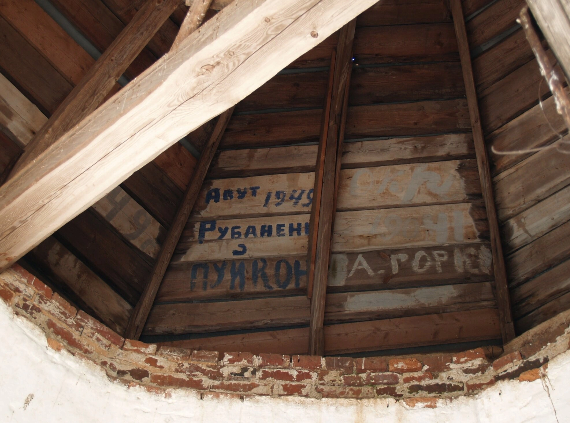 Особый интерес представляют сохранившиеся на деревянных элементах надписи, выполненные синей краской. Чётко различимые датировки "Август 1949 года" свидетельствуют о послевоенных ремонтных работах, проведённых в храме. Надпись "Рубанені" указывает на возможную связь с мастерами из близлежащей деревни Рубаны, участвовавшими в восстановлении святыни. Частично сохранившаяся надпись "Д. А. Горік" или "Горіх" может относиться к имени одного из благотворителей или мастеров, участвовавших в создании или обновлении храмовой конструкции.