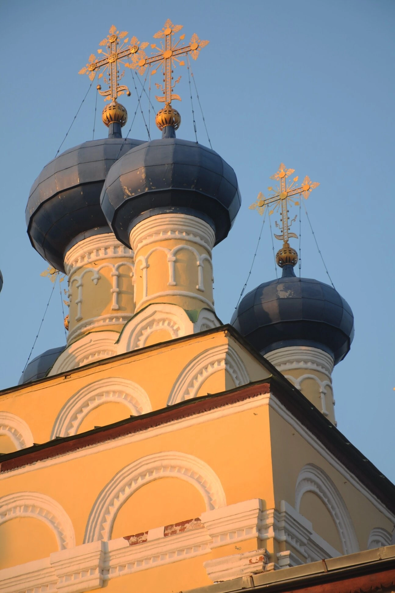На фотографии запечатлён величественный вид завершения Успенской церкви, расположенной в исторической местности Николо-Рожок на берегу озера Селигер в Тверской области. Золотые купола, увенчанные крестами, сияют в лучах солнца, символизируя свет веры и благодати. Данный храм является памятником архитектуры и духовным центром для православных верующих.