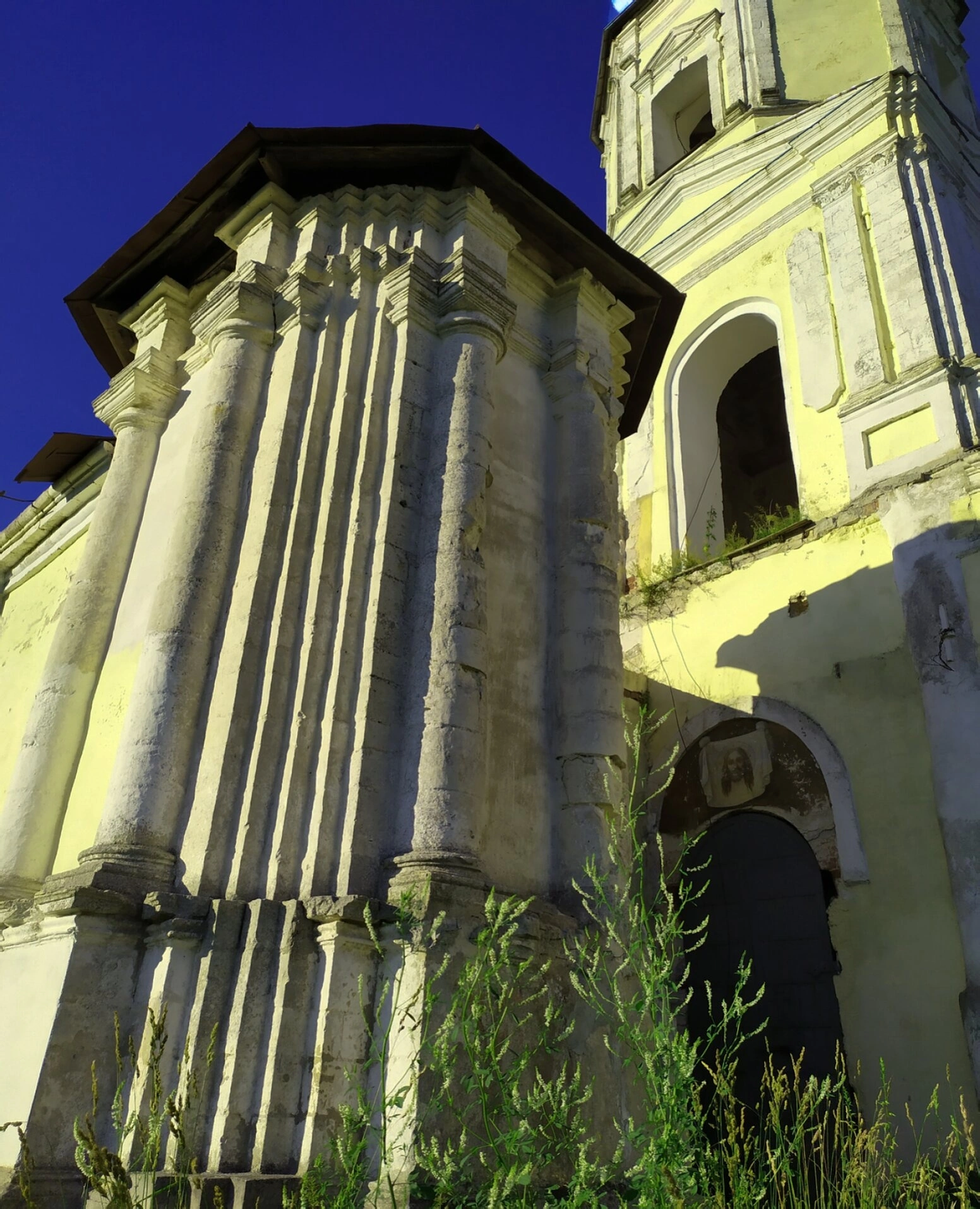 На снимке явственно видны элементы каменного декора, характерные для храмового зодчества: массивные пилястры, украшенные рельефными деталями, и фрагменты стеновой кладки. Несмотря на следы времени и облупившуюся штукатурку, читается благородство и строгость форм, присущая православным церквям.