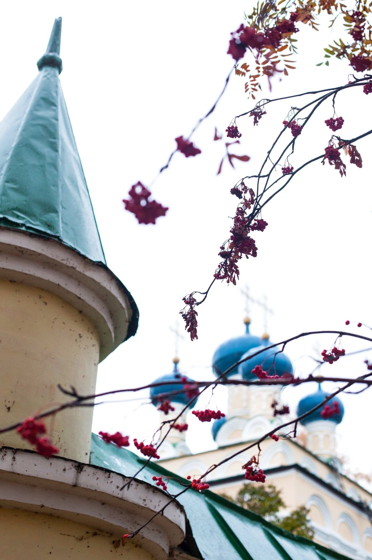 На переднем плане иконического изображения простираются ветви рябины, усыпанные алыми ягодами, что символично в православной традиции и знаменует собою красоту Божьего мира и предзимнее умиротворение. Яркие гроздья оттеняют строгую белизну храмовых стен и синеву небес, создавая дивный контраст тварного и божественного.