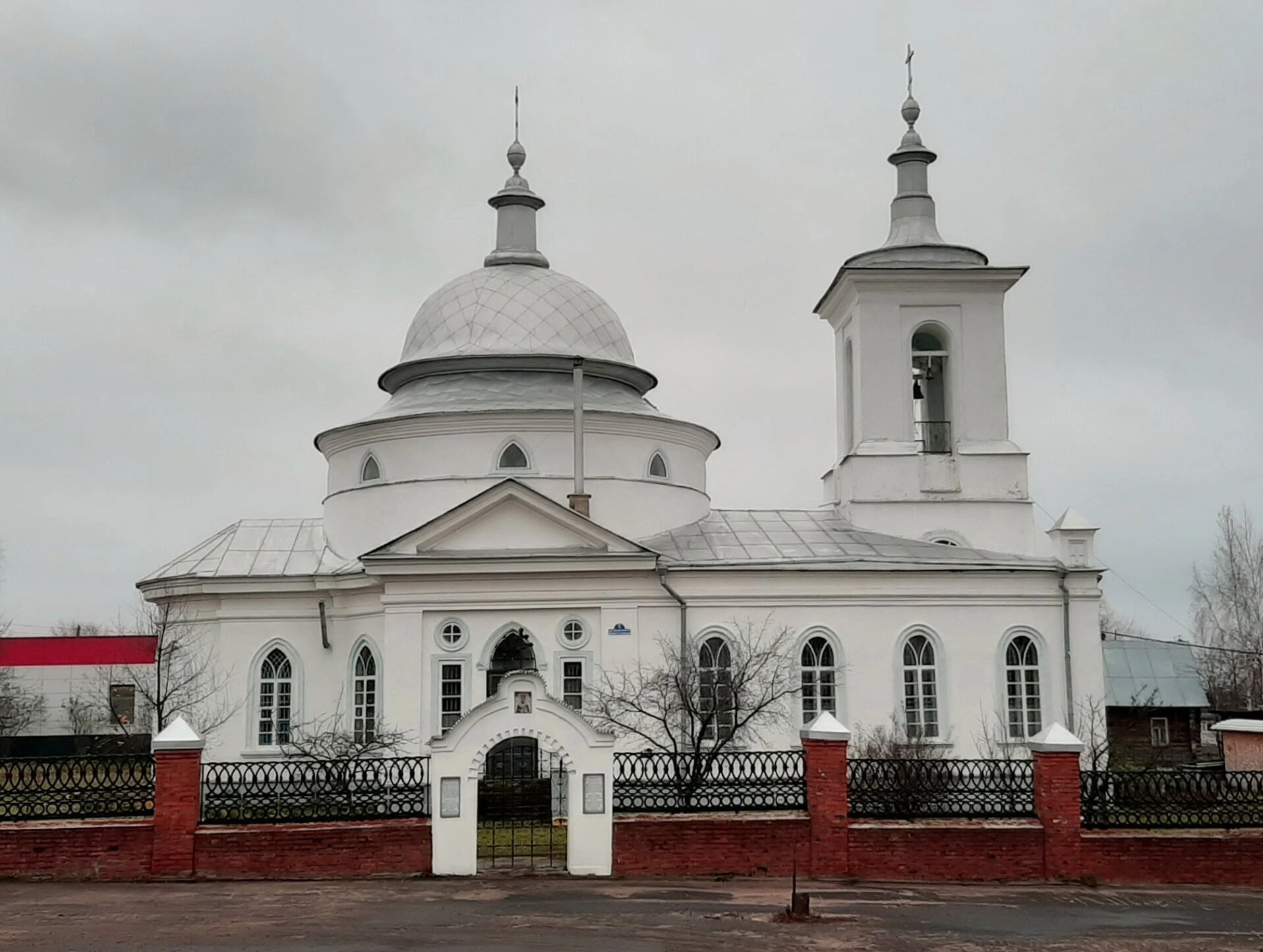 Церковная территория обнесена оградой, состоящей из кирпичных столбов и ажурных кованых секций, что создаёт ощущение уединённости и благоговейной атмосферы. Пасмурное небо на фотографии подчёркивает сдержанную красоту этого духовного места, выделяя белизну стен на фоне окружающего пейзажа.