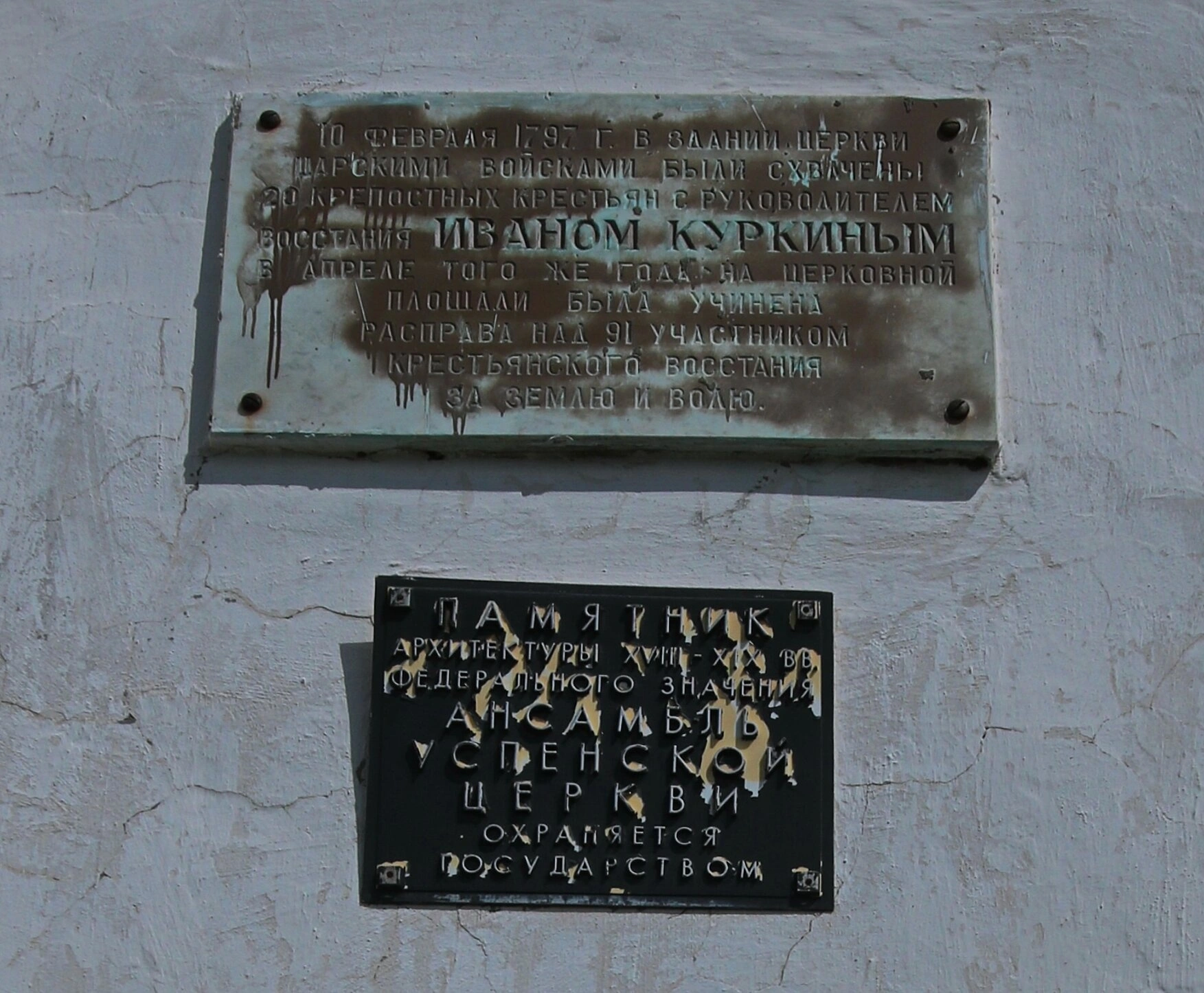 Верхняя мемориальная доска увековечивает память о трагических событиях 10 февраля 1797 года. В этот день в здании церкви царскими войсками были схвачены двадцать крепостных крестьян во главе с предводителем восстания Иваном Куркиным. Эти мужественные люди поднялись на борьбу за землю и волю, выражая глубокую веру в справедливость и лучшую долю. В апреле того же года на церковной площади совершилась расправа над девяносто одним участником этого крестьянского восстания, что стало скорбной страницей в истории русского крестьянства.