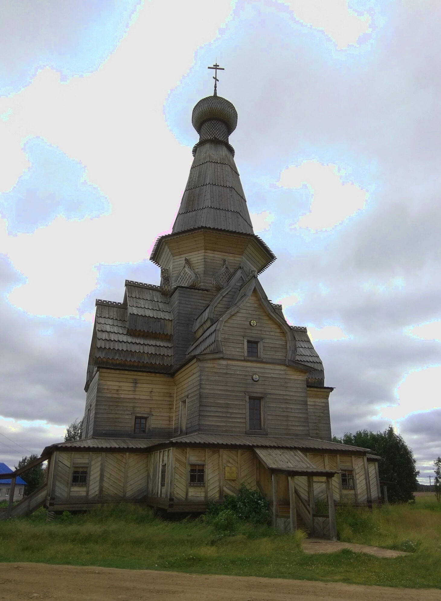 На представленной фотографии запечатлена Успенская церковь — православный храм в честь Успения Пресвятой Богородицы, расположенный в древнем поморском селе Варзуга на южном побережье Кольского полуострова. Этот величественный памятник русского деревянного зодчества, возведённый в 1674 году, является одной из главных святынь Мурманской области и выдающимся образцом шатровой архитектуры.