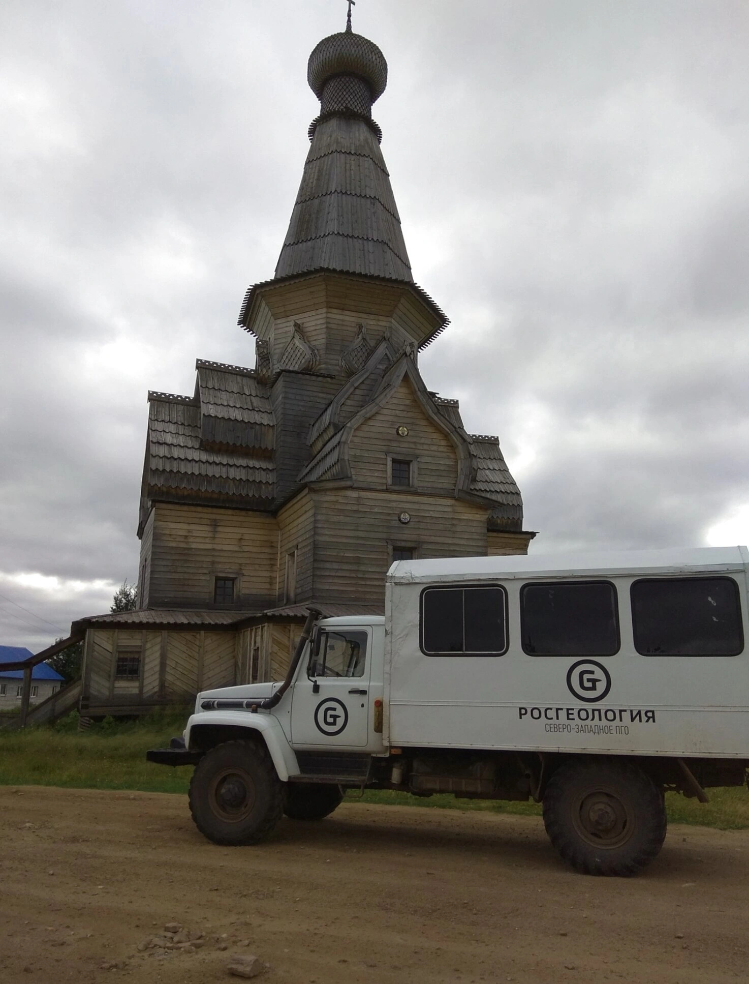 Успенская церковь в селе Варзуга с автомобилем Росгеологии