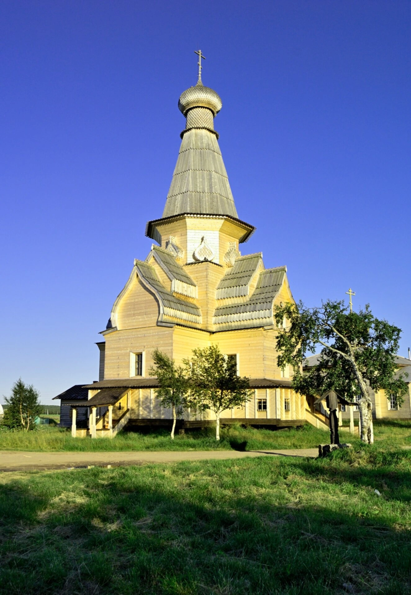Снимок сделан в ясный летний день, когда солнечный свет мягко высвечивает текстуру дерева и оттеняет совершенство архитектурных линий. Храм располагается на невысоком возвышении, что зрительно усиливает его устремлённость ввысь. Зелёный травяной покров и окружающие деревья подчёркивают гармонию рукотворного сооружения с суровой, но прекрасной северной природой. Общий вид передаёт атмосферу благодати, спокойствия и незыблемости православной веры в этом отдалённом уголке России.