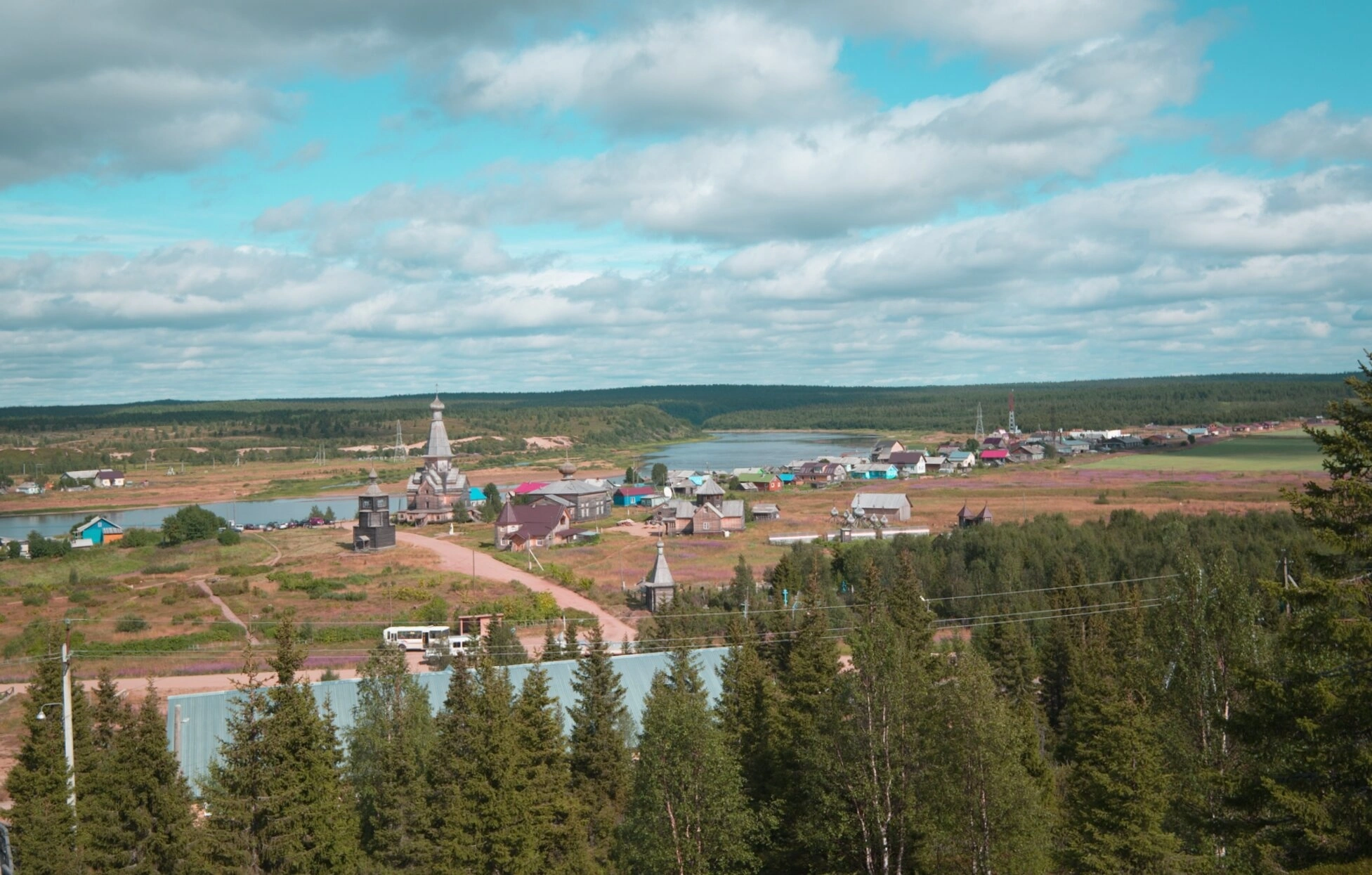 На представленной фотографии запечатлен величественный панорамный вид на древнее поморское село Варзуга, раскинувшееся на живописном Терском берегу Белого моря в Мурманской области. Центральным объектом снимка, доминирующим над окружающим пространством, предстает многоглавая Успенская церковь, освященная в честь Успения Пресвятой Богородицы. Этот выдающийся памятник федерального значения был возведен в 1674 году по благословению Святейшего Патриарха Никона и является одним из высочайших деревянных храмов России, достигая в высоту тридцати четырех метров.