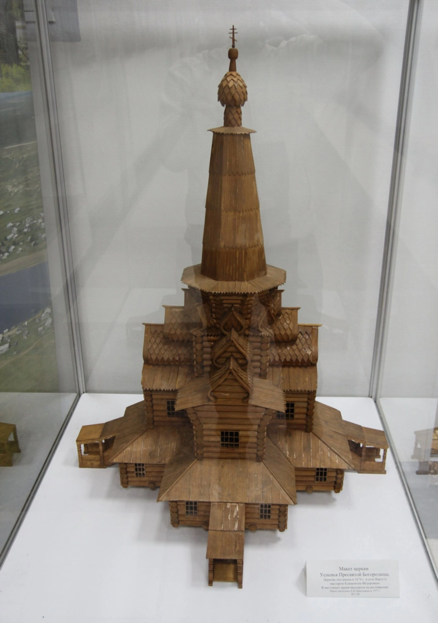 На фотографии запечатлен макет Успенской церкви, расположенной в селе Варзуга Терского района Мурманской области. Этот точный макет воссоздает облик выдающегося памятника русского деревянного зодчества, Церкви Успения Пресвятой Богородицы, возведенной в 1674 году. Макет был изготовлен в 1961 году архитектором Н. П. Быстряковым и хранится в Мурманском областном краеведческом музее, наглядно демонстрируя первоначальный вид храма.