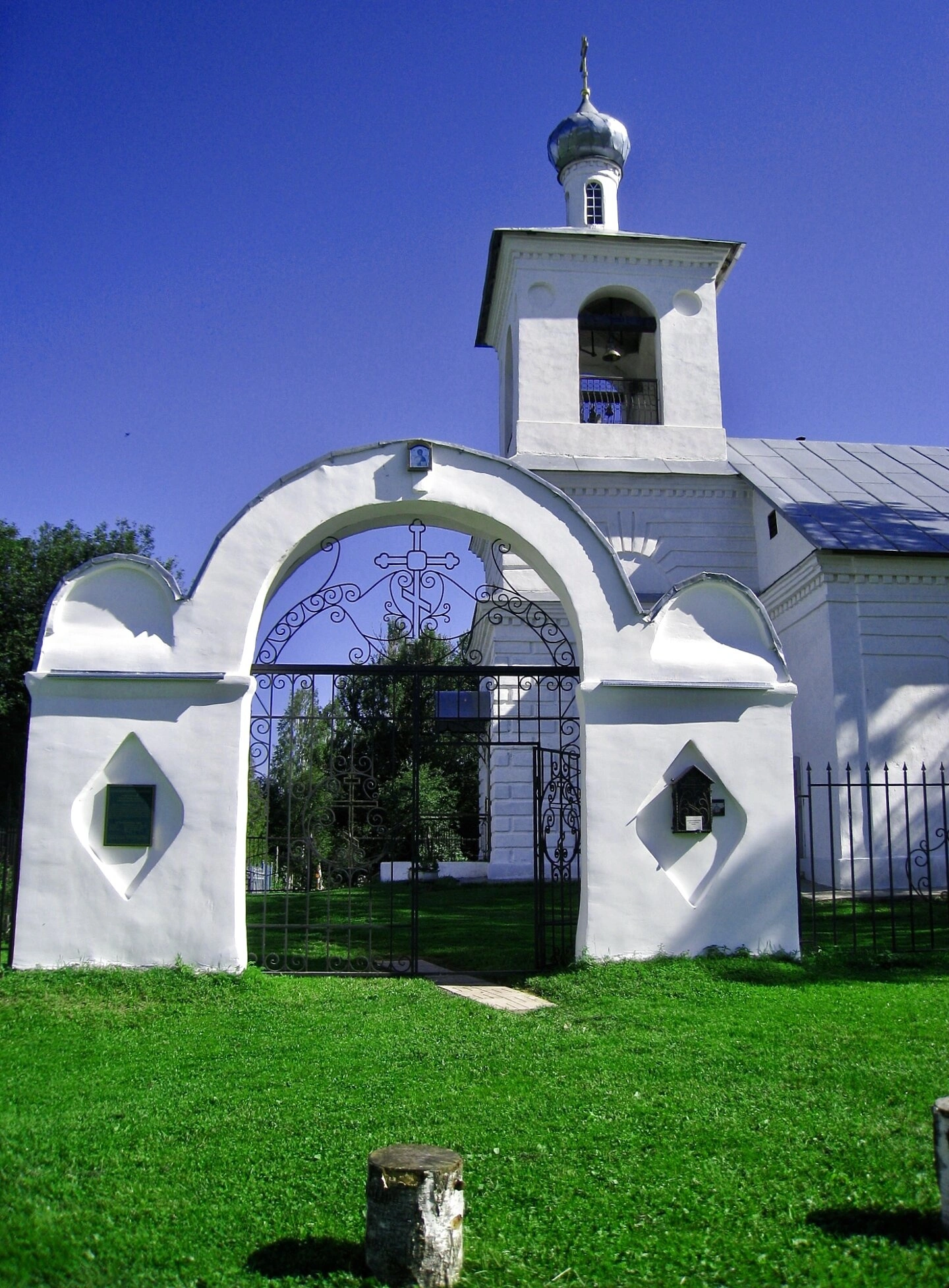 На переднем плане фотографии видны величественные белокаменные ворота с арочным проемом, украшенные кованой решеткой с православными крестами и изящными узорами. По обеим сторонам от центральной арки расположены небольшие квадратные ниши, в одной из которых размещена информационная табличка.