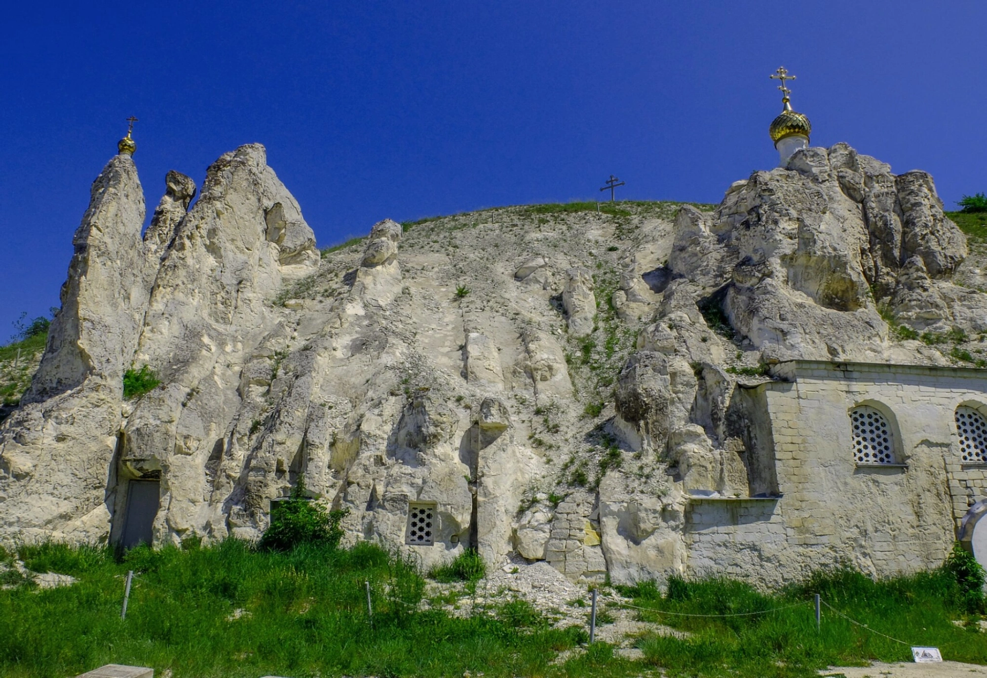 Основание монастыря преданием относит к XVII веку, а его история неразрывно связана с пещерными подвижниками, искавшими уединения для безмолвной молитвы. Главной святыней обители является чудотворная Сицилийская икона Божией Матери, список которой был принесён сюда основателями. В толще меловой горы монахами-подвижниками были вручную вырублены пещерные храмы, келии и протяжённые галереи. На снимке можно видеть один из таких храмов — в честь Рождества святого Пророка, Предтечи и Крестителя Господня Иоанна, чьи белоснежные стены являются частью самой горы.
