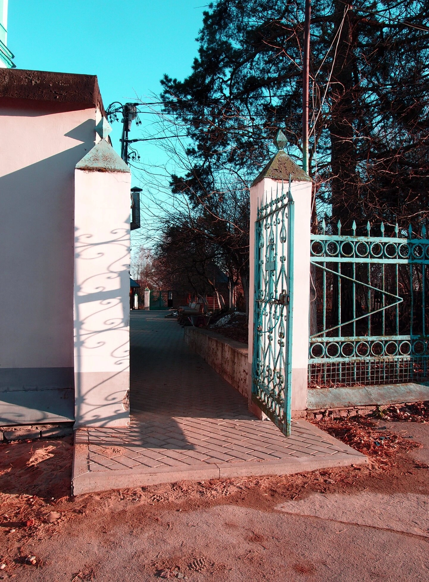 На фотографии запечатлен вход на территорию храма Успения Пресвятой Богородицы в подмосковной деревне Обухово. Кованые ворота синего цвета, украшенные декоративными элементами, распахнуты для всех верующих и паломников, приходящих помолиться в этот святой храм. По обе стороны ворот возвышаются массивные светлые столбы, увенчанные изящными завершениями, напоминающими церковные главки.
