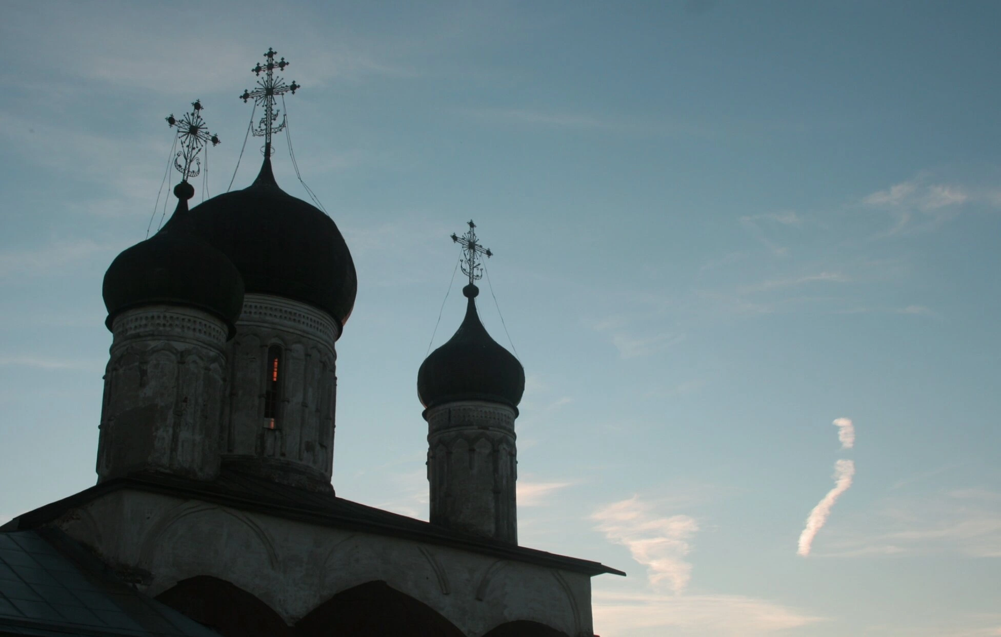 Особую духовную атмосферу снимку придает сумеречное освещение. Храм изображен на фоне светлого неба с легкими облаками, что создает впечатление устремленности к горнему миру. В небесной выси виден инверсионный след, который не нарушает общего настроения умиротворения и молитвенного покоя.