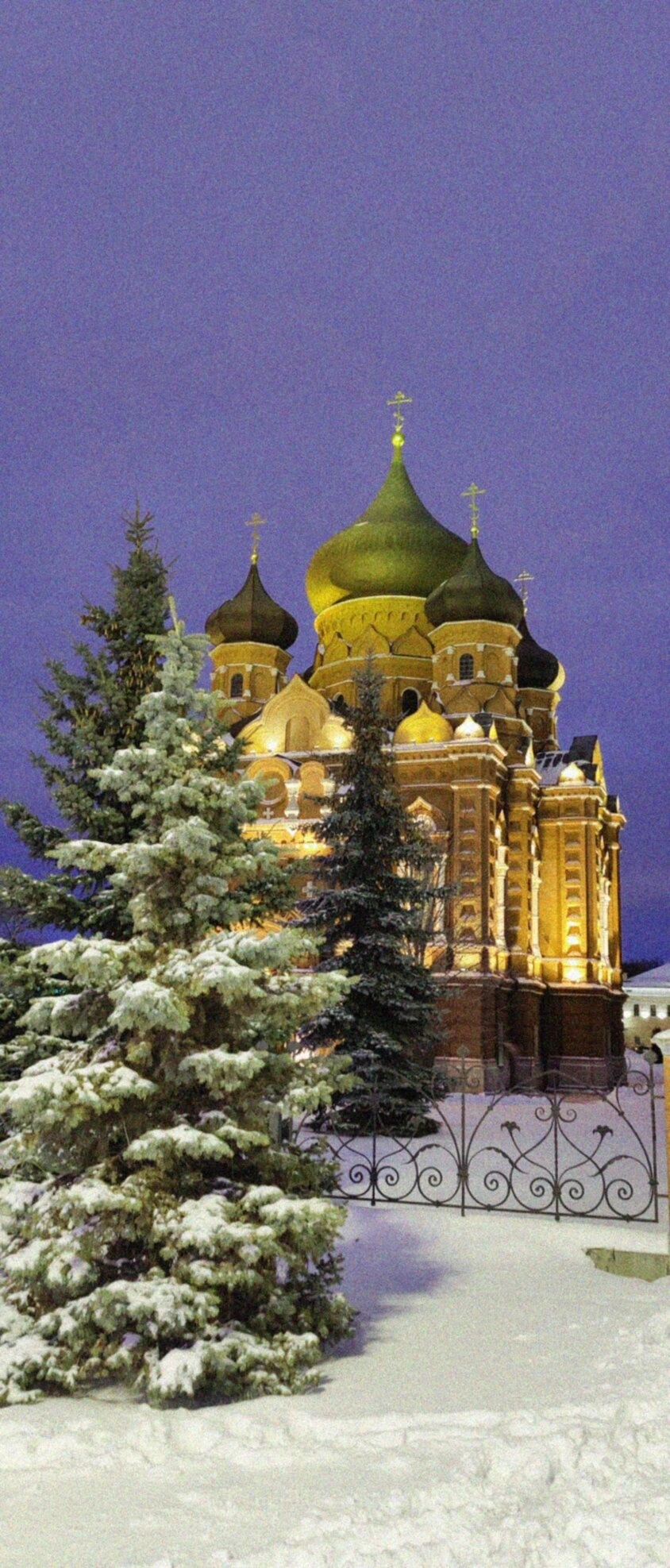 Первопланный вид занимают пушистые, укрытые снегом ветви елей и ажурная кованая ограда, подчёркивающие величие православной святыни. Тёплый свет из окон и мощное архитектурное освещение делают собор видимым издалека, символизируя собою нетварный свет веры во тьме мирской.