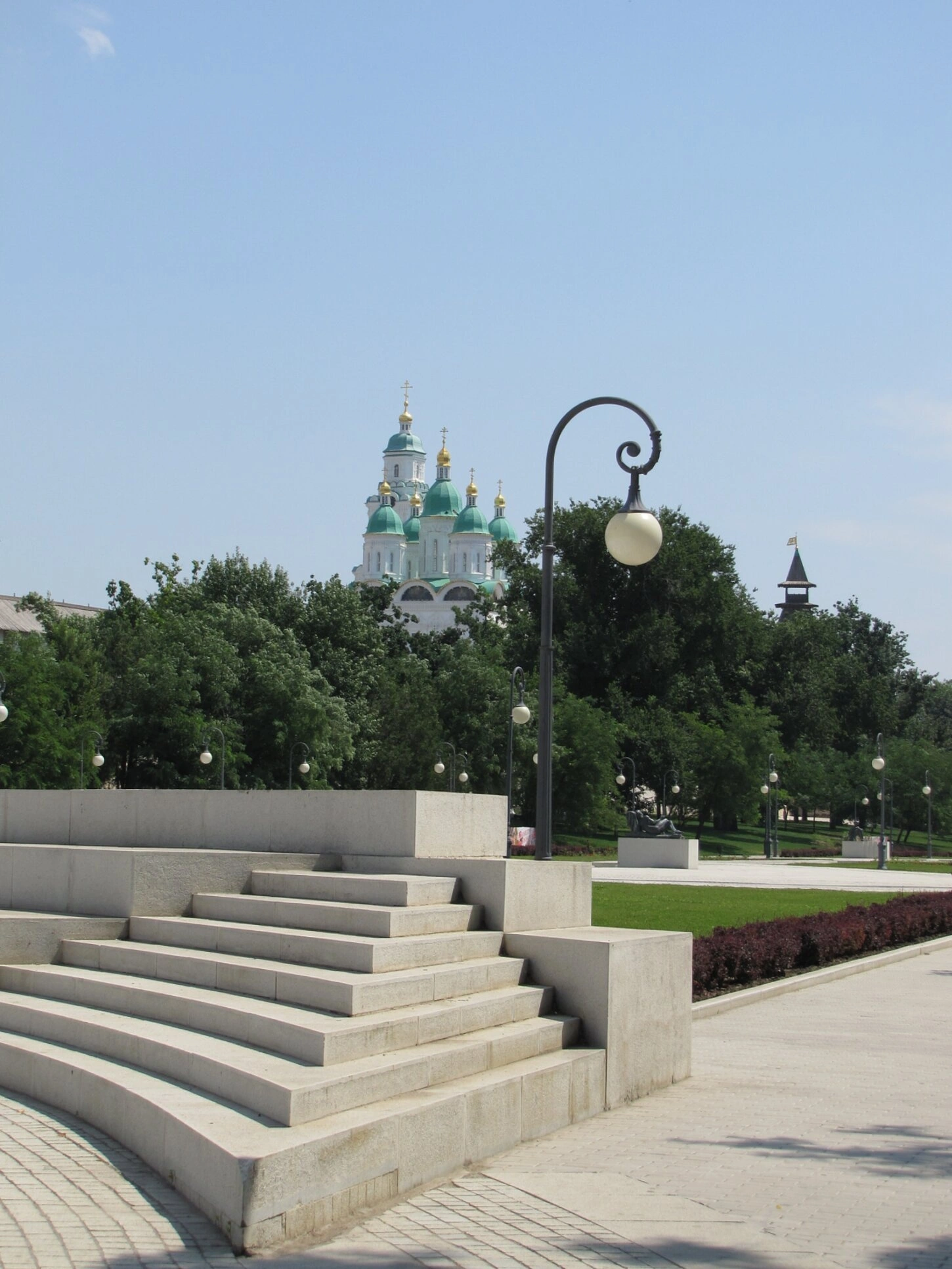 На представленной фотографии запечатлён величественный Успенский кафедральный собор, расположенный на территории Астраханского кремля. Этот выдающийся памятник церковной архитектуры был возведён в начале XVIII века под руководством зодчего Дорофея Мякишева и освящён в честь Успения Пресвятой Богородицы.