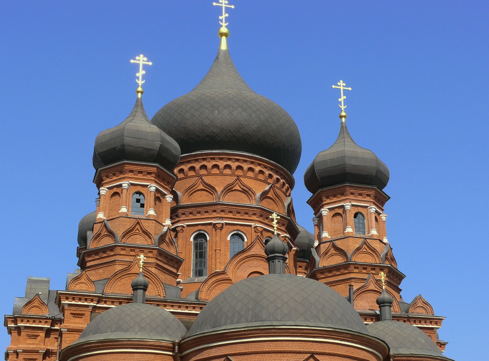 На представленной фотографии запечатлён величественный Успенский кафедральный собор, второй кафедральный собор Тульской епархии, освящённый в честь Успения Пресвятой Богородицы. Снимок детально передаёт благолепие верхней части храма, включая его главки, увенчанные златоглавыми крестами, возносящимися к чистому голубому небу.