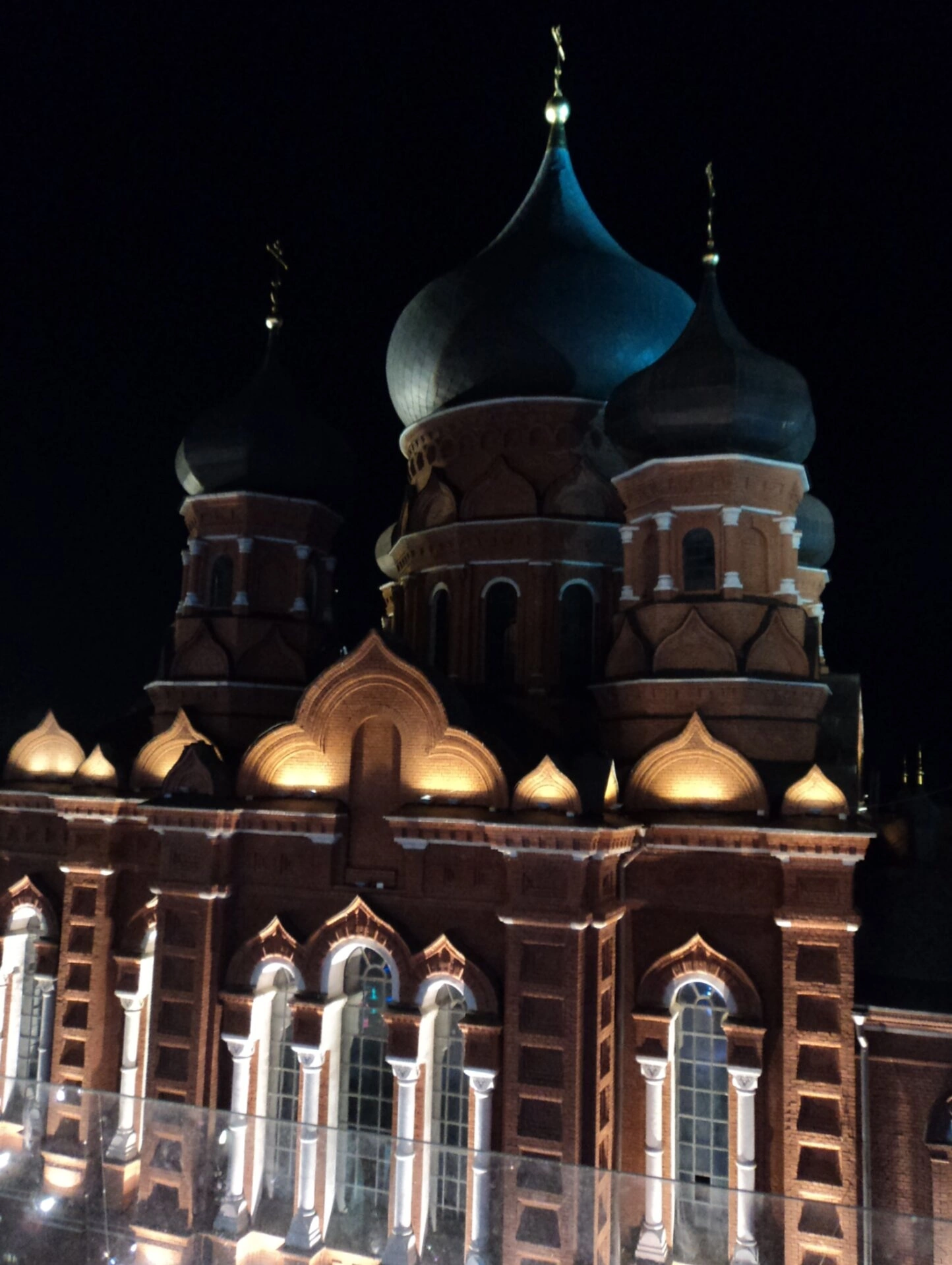 Собор, освящённый в честь Успения Пресвятой Богородицы, выполнен в русско-византийском стиле из красного кирпича и увенчан пятью главами, символизирующими Господа нашего Иисуса Христа и четырёх евангелистов. В ночное время искусная подсветка, направленная снизу, эффектно выделяет архитектурные элементы храма: арочные окна, закомары, килевидные кокошники и богатый декоративный фриз. Тёмные купола, завершающиеся золочёными крестами, создают выразительный силуэт на фоне тёмного неба.