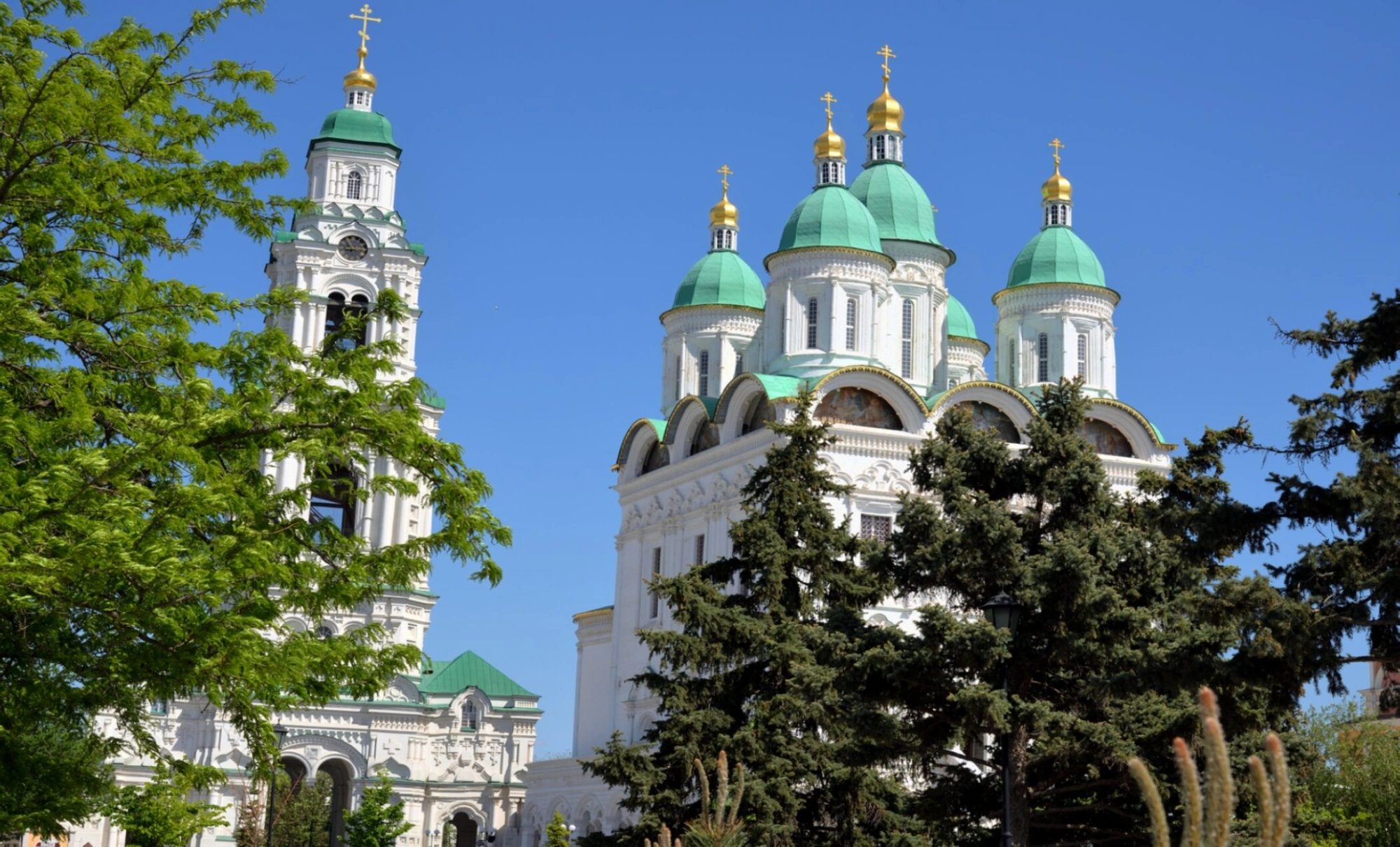 На представленной фотографии запечатлён величественный Успенский собор, расположенный на территории Астраханского кремля. Этот кафедральный собор, освящённый в честь Успения Пресвятой Богородицы, является духовным центром Астраханской епархии и одним из наиболее значимых памятников православной архитектуры на юге России.